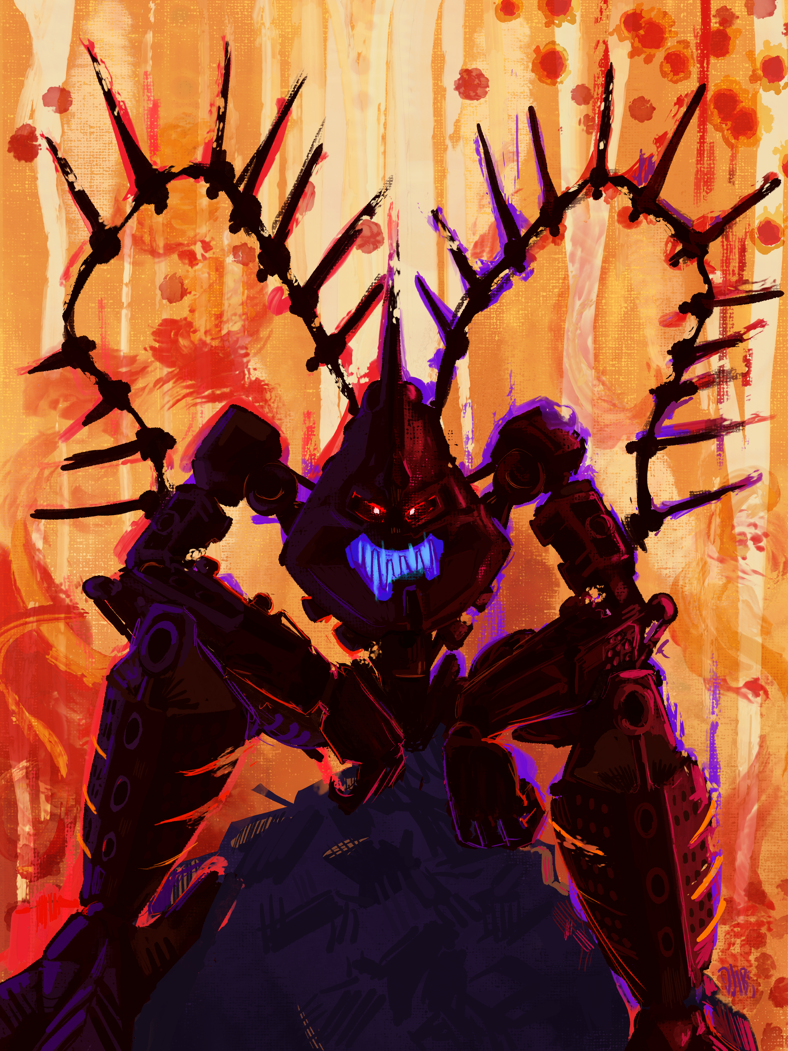 1boy absurdres avak_(bionicle) backlighting bionicle clenched_teeth cmccillustr8 glowing glowing_eyes highres leaning_forward lego looking_at_viewer orange_background red_eyes sharp_teeth sitting solo spikes straight-on teeth the_lego_group