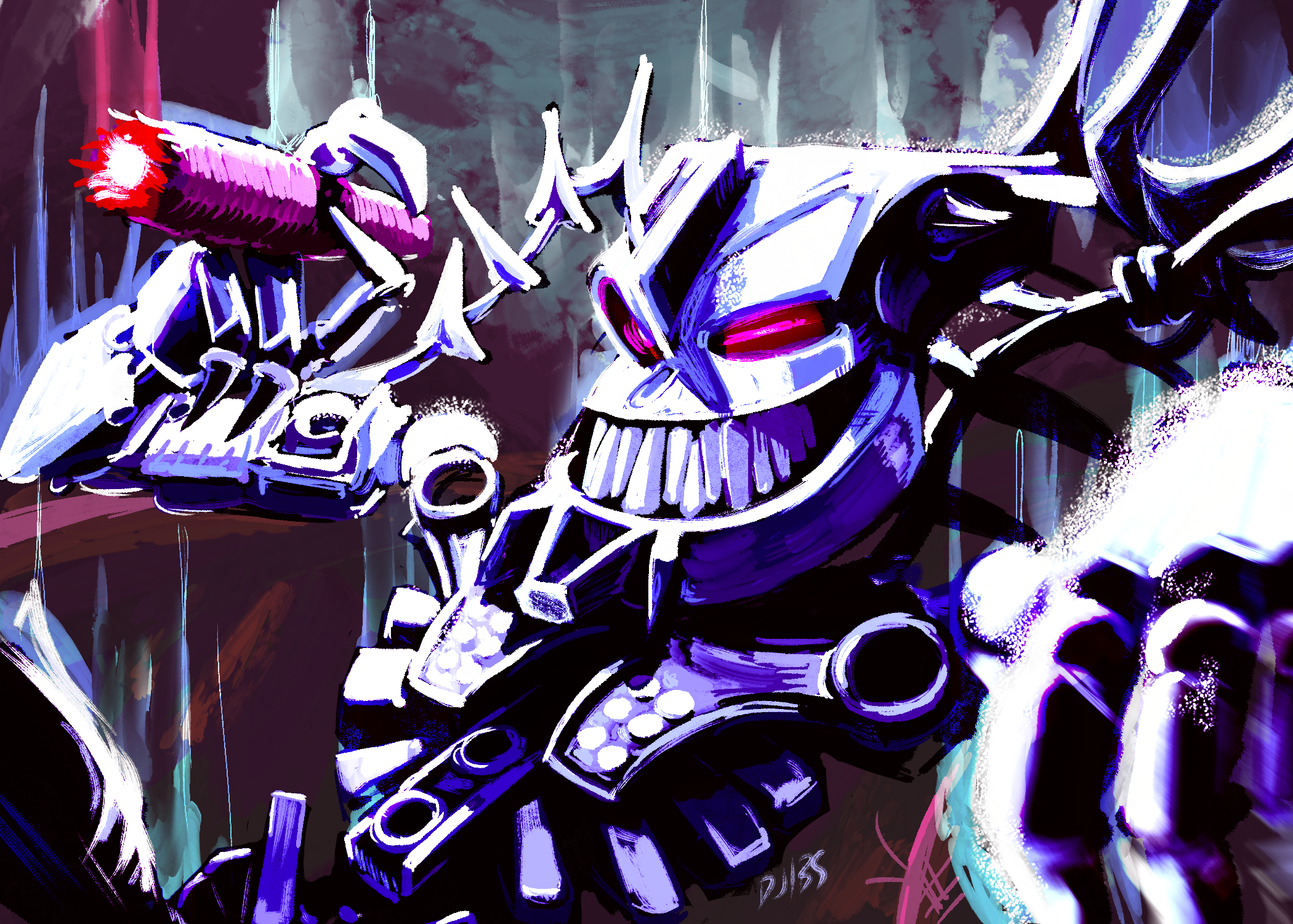 artist_name bionicle cigar cmccillustr8 glowing glowing_eyes highres holding holding_cigar humanoid_robot leaning_back looking_at_viewer pink_eyes robot sharp_teeth sitting smile spikes teeth the_lego_group thok_(bionicle)