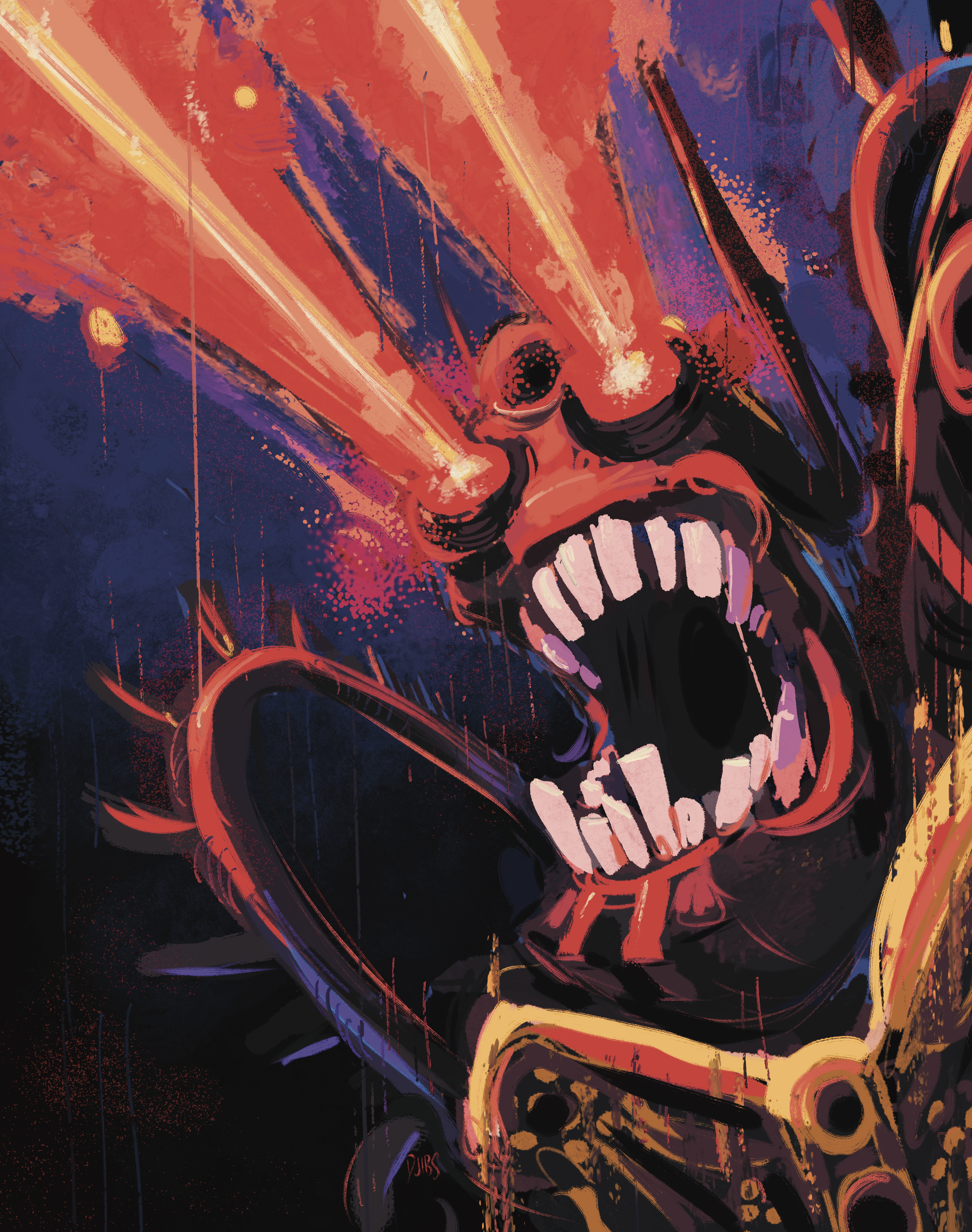 absurdres bionicle cable cmccillustr8 highres humanoid_robot laser looking_up open_mouth portrait purple_background red_eyes reidak_(bionicle) robot spikes the_lego_group