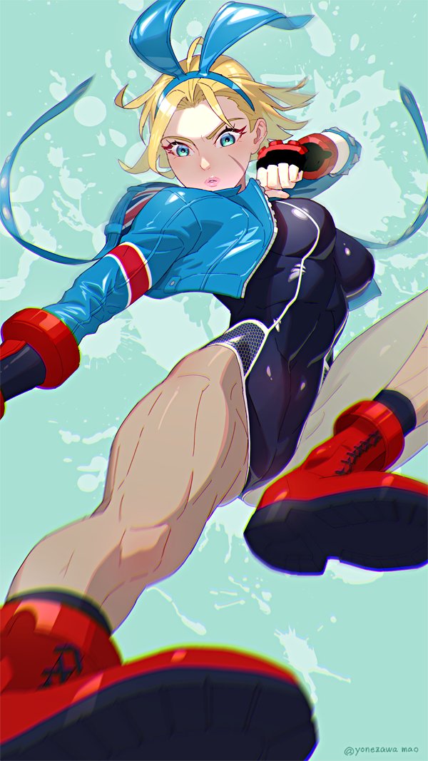 1girl alternate_costume blonde_hair blue_eyes boots cammy_white combat_boots facial_scar jacket kicking leotard looking_at_viewer ribbon scar scar_on_cheek scar_on_face short_hair solo street_fighter street_fighter_6 thong_leotard yonezawa_mao