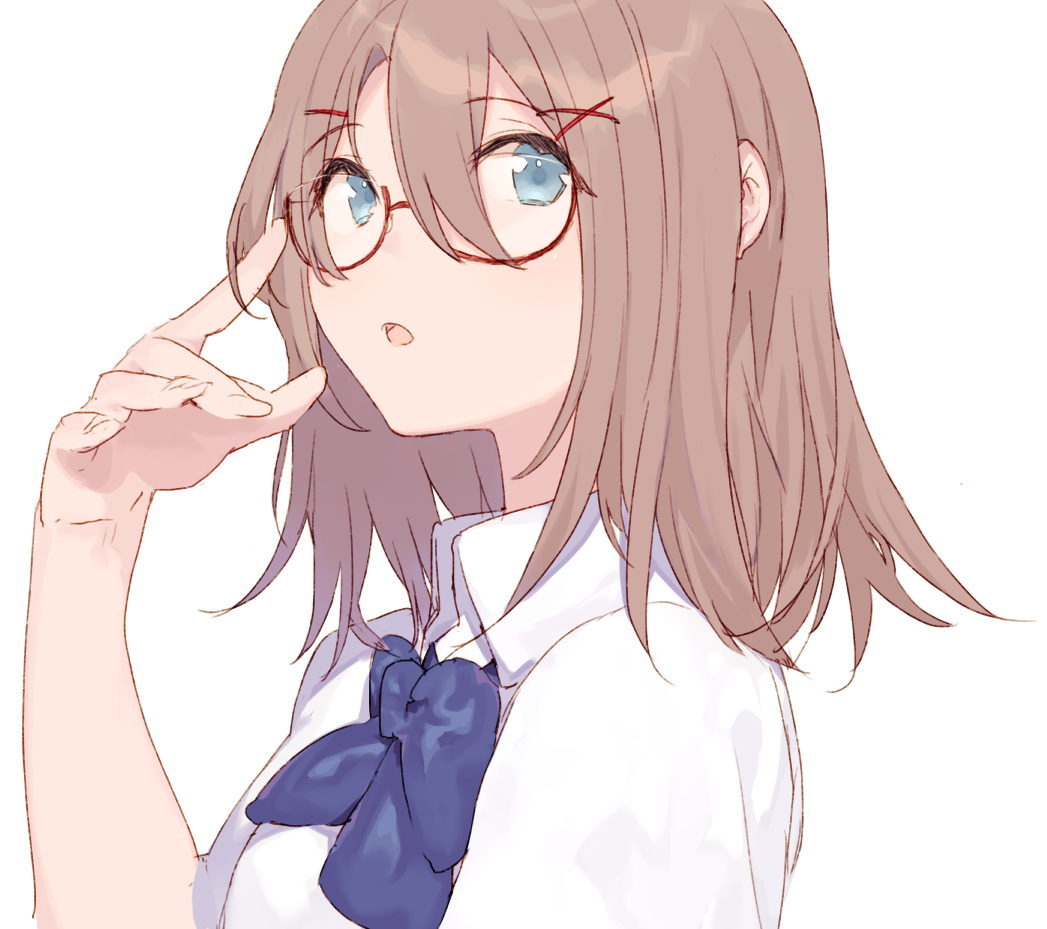 1girl :o adjusting_eyewear bad_id bad_pixiv_id blue_bow blue_bowtie blue_eyes bow bowtie brown_hair collared_shirt fifuth glasses hair_between_eyes hair_ornament hairclip hand_up looking_at_viewer medium_hair open_mouth original parted_lips red-framed_eyewear school_uniform shirt short_sleeves simple_background solo upper_body white_background white_shirt x_hair_ornament