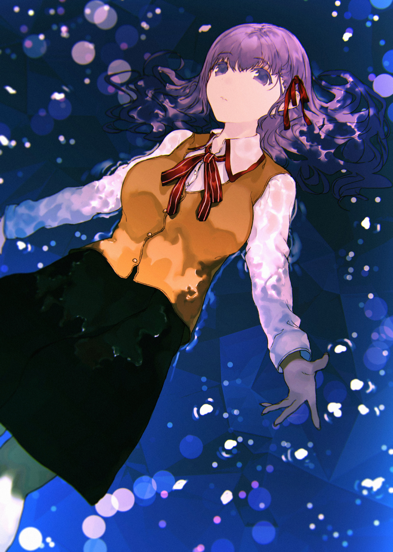 1girl afloat bad_id bad_pixiv_id black_skirt breasts brown_vest closed_mouth collared_shirt fate/stay_night fate_(series) fifuth hair_ribbon homurabara_academy_school_uniform large_breasts long_hair long_sleeves looking_at_viewer lying matou_sakura neck_ribbon on_back partially_submerged purple_eyes purple_hair red_ribbon ribbon school_uniform shirt skirt solo striped_ribbon vest water wet wet_clothes white_shirt