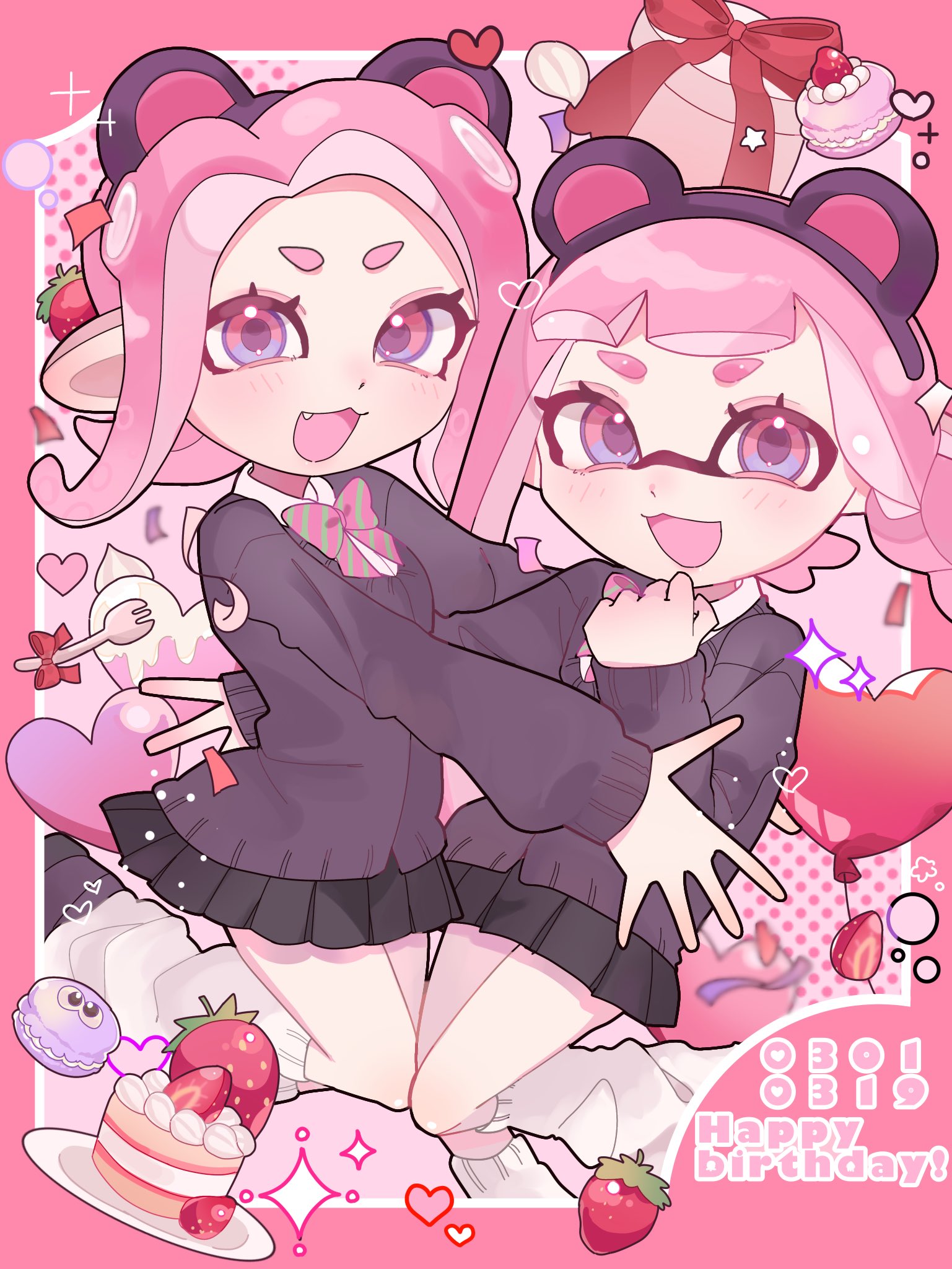 2girls :d animal_ear_hairband animal_ears balloon bear_ears black_hairband black_skirt border bow bowtie cake commentary_request dessert eyelashes fake_animal_ears fang food fork fruit green_bow green_bowtie hairband happy_birthday highres inkling inkling_girl inkling_player_character kobanban0319 long_hair looking_at_viewer macaron multiple_girls nintendo octoling octoling_girl octoling_player_character open_mouth outside_border pink_border pink_bow pink_bowtie pink_hair pleated_skirt skirt smile sparkle splatoon_(series) splatoon_3 strawberry strawberry_shortcake striped_bow striped_bowtie striped_clothes tentacle_hair thick_eyebrows two-tone_bow two-tone_bowtie