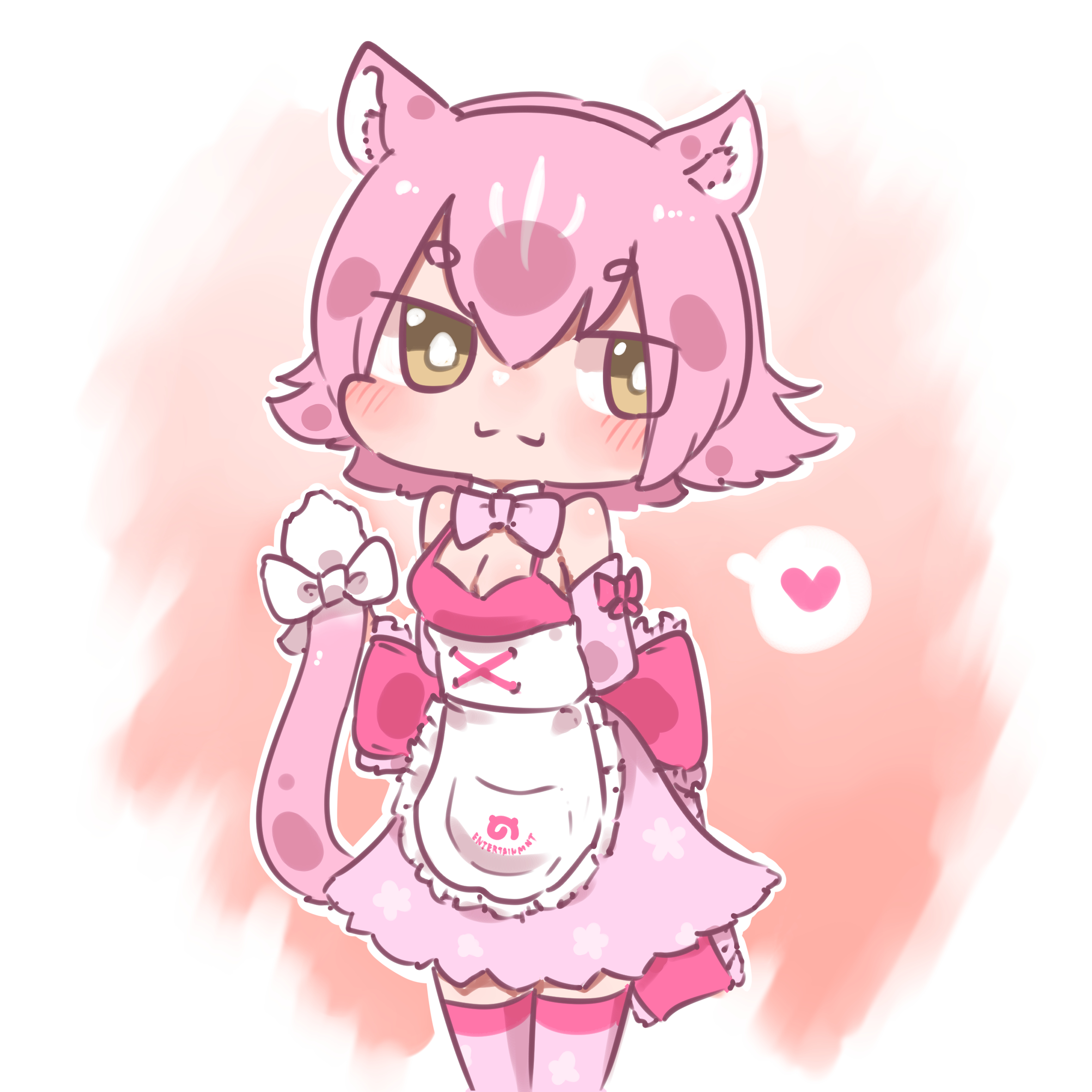 1girl animal_ears apron arms_behind_back back_bow bare_shoulders bow bowtie chai_chai_huishi cowboy_shot detached_collar frilled_apron frilled_bow frills hair_between_eyes heart high-waist_skirt highres japari_symbol kemono_friends panther_ears panther_girl panther_tail peach_panther_(kemono_friends) pink_bow pink_bowtie pink_hair pink_shirt pink_skirt pink_thighhighs shirt short_hair sidelocks skirt sleeveless solo spoken_heart tail tail_bow tail_ornament thighhighs white_apron yellow_eyes zettai_ryouiki