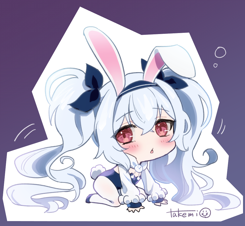1girl all_fours animal_ears azur_lane blue_leotard blue_ribbon blush chibi crossed_bangs fake_animal_ears fake_tail hair_ribbon laffey_(azur_lane) laffey_ii_(azur_lane) laffey_ii_(sleepy_on_a_busy_day)_(azur_lane) leotard long_hair long_sleeves looking_at_viewer official_alternate_costume pantyhose playboy_bunny purple_background rabbit_ears rabbit_tail red_eyes ribbon signature simple_background solo tail takemi_mochi white_hair white_pantyhose white_sleeves
