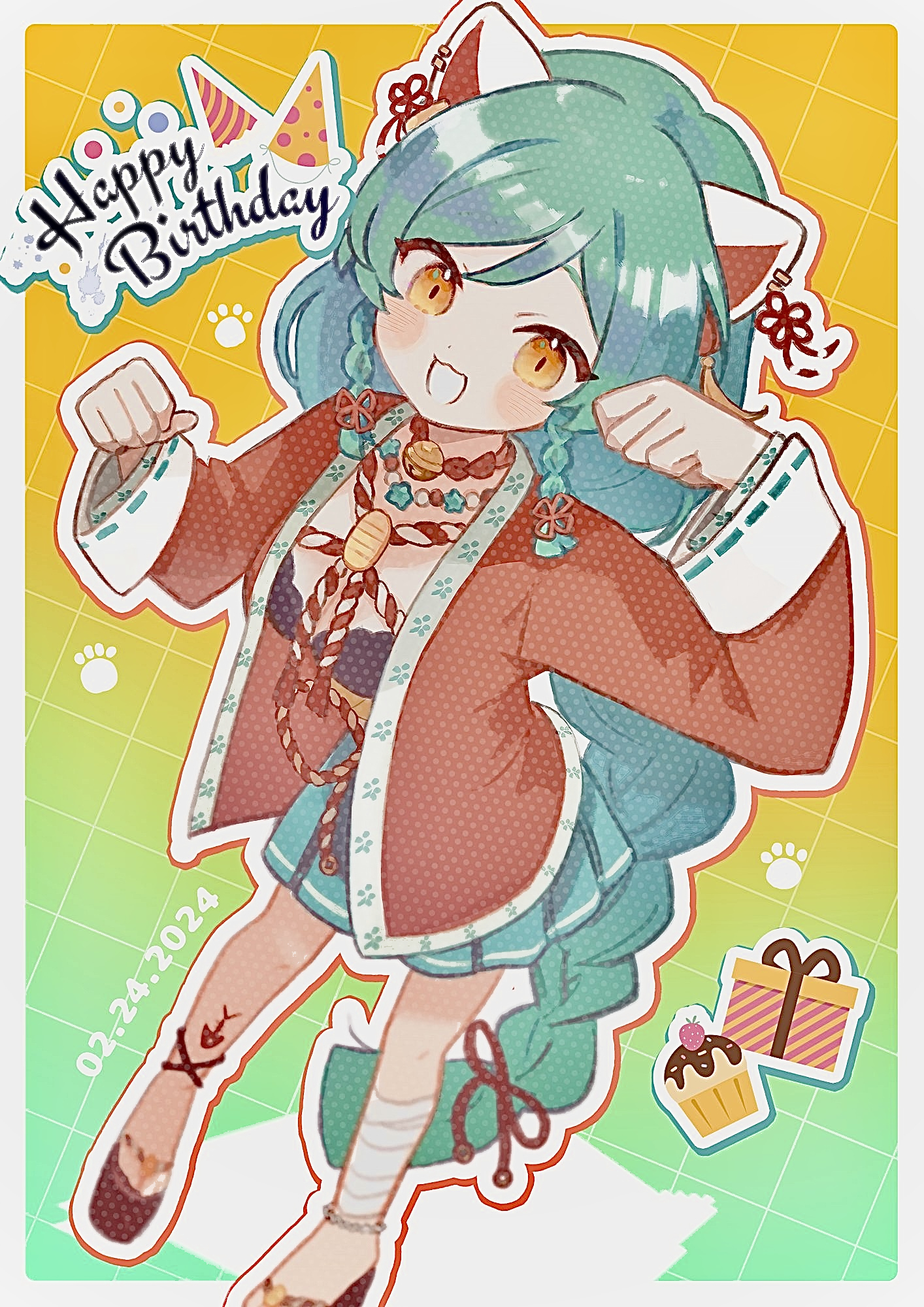 1girl :3 animal_ears blush braid breasts brown_eyes cat_ears cat_girl cb_ge000 green_hair green_skirt happy_birthday highres indie_virtual_youtuber large_breasts long_sleeves looking_at_viewer omocat_(character) open_mouth pleated_skirt single_braid skirt smile solo virtual_youtuber