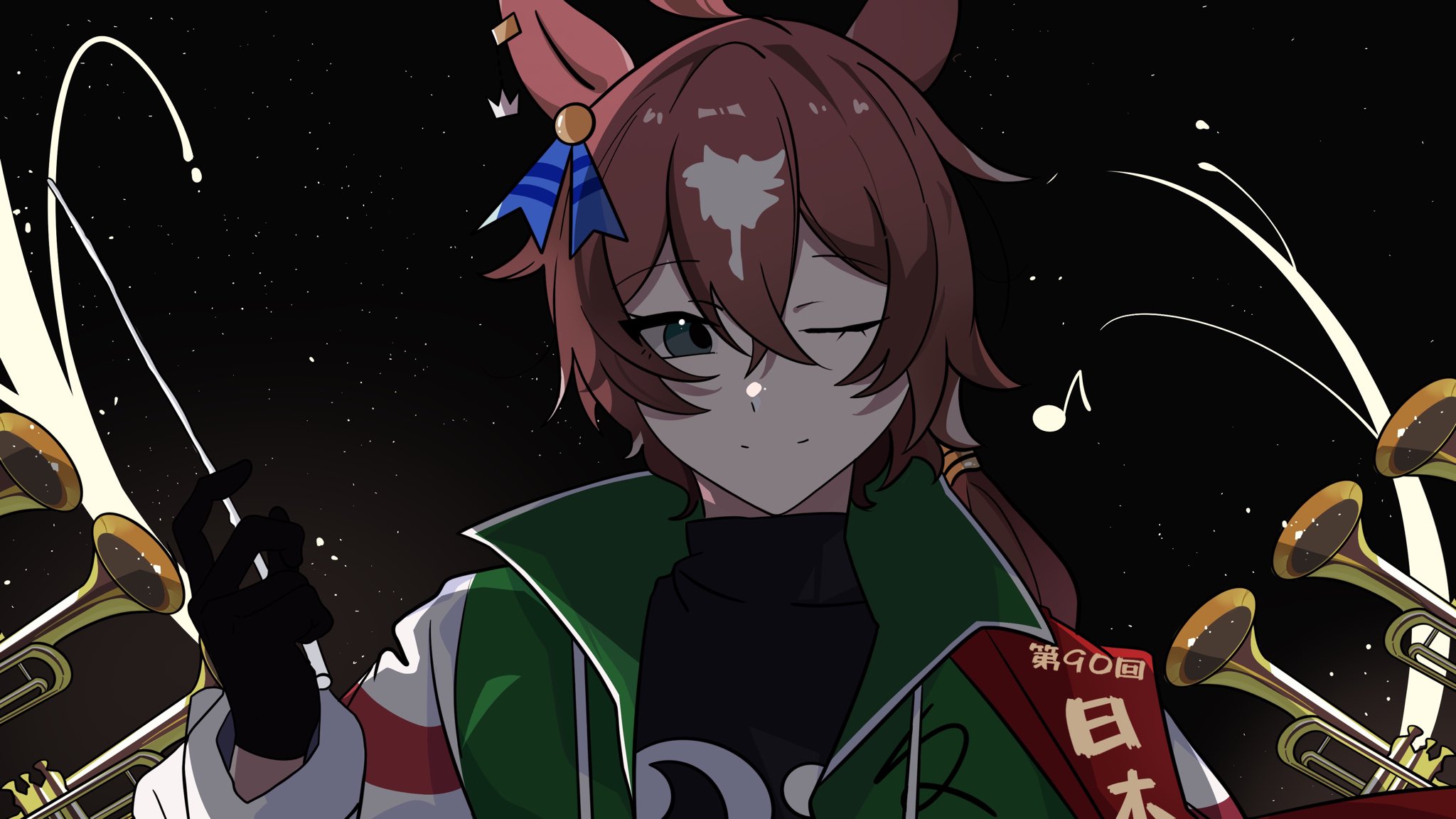 ahoge animal_ears black_gloves black_shirt brown_hair closed_mouth commentary_request ear_ornament gloves green_eyes green_jacket hair_between_eyes hair_ornament highres horse_ears horse_girl jacket kukmmo long_sleeves looking_at_viewer multicolored_hair musical_note night one_eye_closed real_life shirt short_hair sky smile star_(sky) streaked_hair sweater tastiera_(racehorse) translation_request turtleneck turtleneck_sweater umamusume white_hair