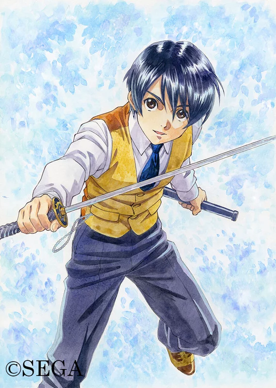 1boy black_hair blue_background blue_necktie blue_pants brown_eyes brown_footwear chain collar collared_shirt english_text fighting_stance formal_clothes holding holding_sword holding_weapon katana long_sleeves looking_at_viewer male_focus matsubara_hidenori necktie nose official_art open_mouth pants pocket sakura_taisen sakura_taisen_v sega sheath sheathed shirt short_hair simple_background smile solo solo_focus sword taiga_shinjirou unsheathing vest weapon white_collar white_shirt white_sleeves yellow_vest