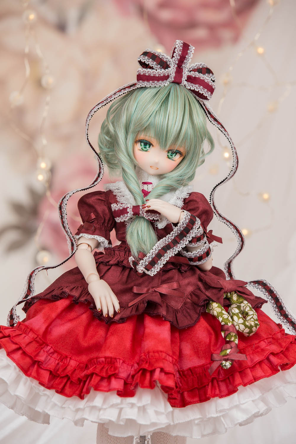 1girl accurate_lolita_coord adapted_costume arm_ribbon blurry blurry_background character_doll cowboy_shot doll doll_joints dress figure frilled_dress frills front_ponytail green_eyes green_hair hair_ribbon hand_up highres joints kagiyama_hina lace lace-trimmed_dress lace-trimmed_ribbon lace_trim lolita_fashion long_hair looking_at_viewer miyako_sasara nail_polish petticoat photo_(medium) puffy_short_sleeves puffy_sleeves red_dress red_nails red_ribbon ribbon short_sleeves solo standing touhou volks_dd