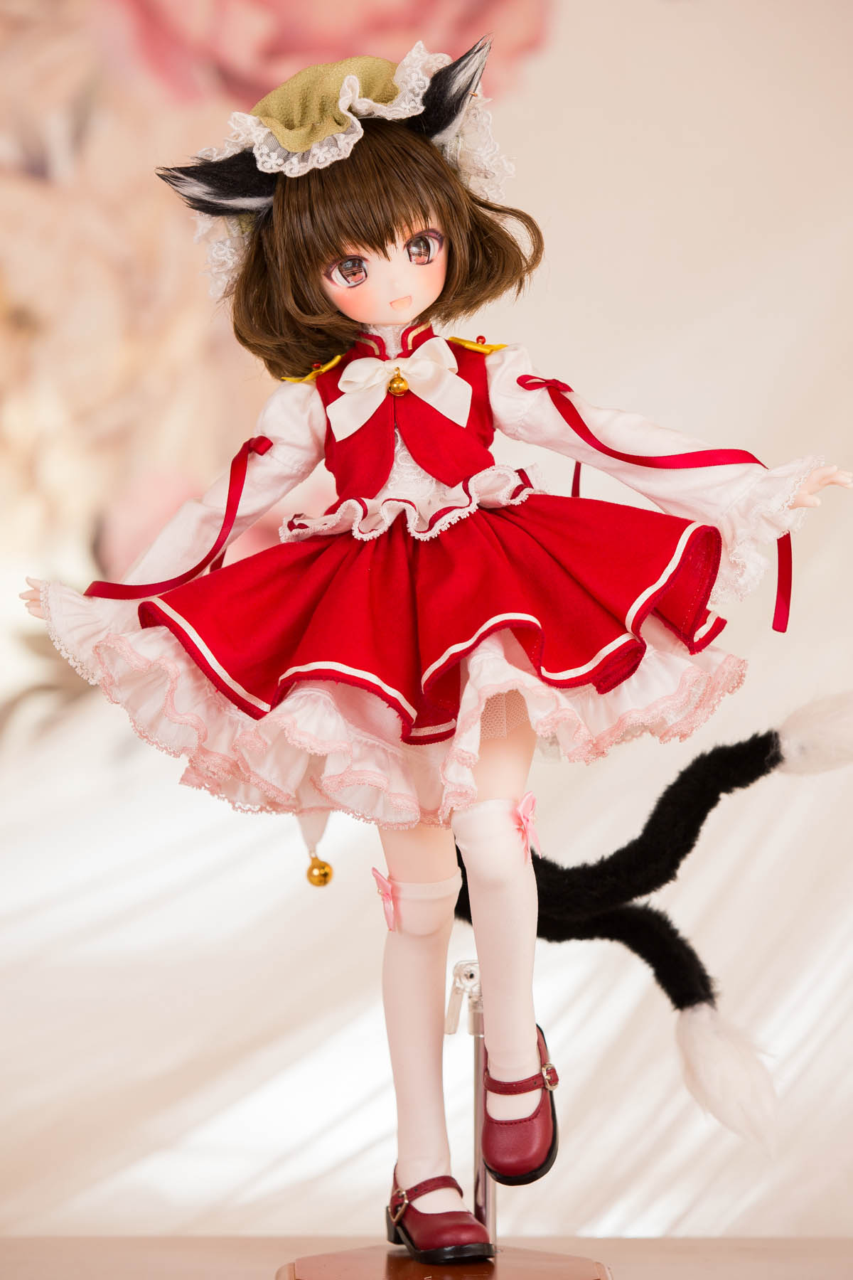 1girl animal_ears bell blurry blurry_background brown_eyes brown_hair cat_ears cat_girl cat_tail character_doll chen doll figure full_body hat highres jingle_bell kneehighs lace lace-trimmed_headwear lace-trimmed_shirt lace_trim long_sleeves looking_at_viewer mary_janes medium_hair miyako_sasara mob_cap multiple_tails neck_ribbon nekomata open_mouth photo_(medium) red_ribbon red_shoes red_skirt red_vest ribbon shirt shoes skirt skirt_set sleeves_past_wrists smile socks solo standing standing_on_one_leg tail touhou two_tails vest white_ribbon white_shirt white_socks