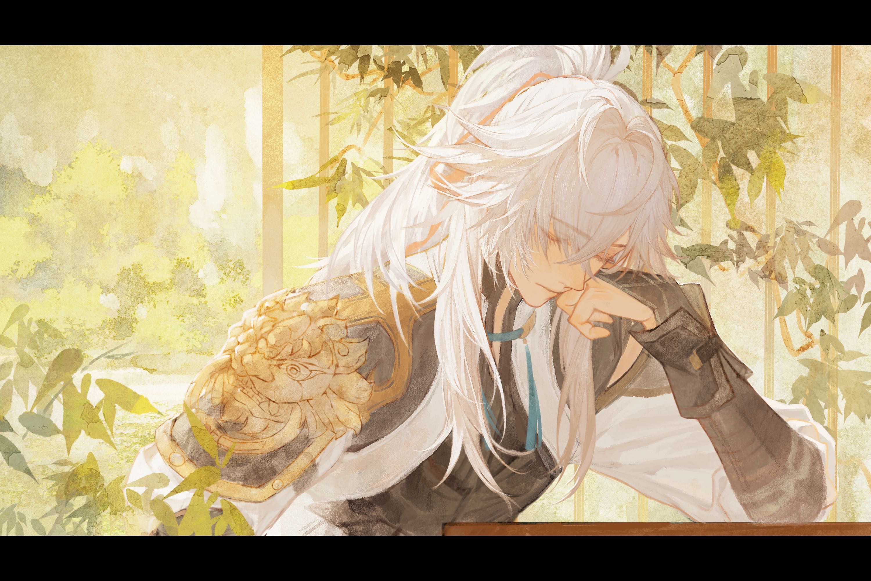 1boy armor bridal_gauntlets calendulamew chinese_commentary closed_eyes commentary_request crossed_bangs elbow_rest expressionless eyes_visible_through_hair from_side hair_intakes head_on_hand high_ponytail highres honkai:_star_rail honkai_(series) jing_yuan leaf leaning letterboxed long_hair male_focus pauldrons ponytail shoulder_armor solo tassel upper_body white_hair