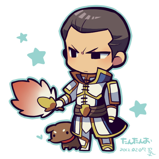 1boy arm_at_side armor black_eyes black_hair blue_outline chibi chibi_only chinese_armor chinese_clothes closed_mouth dated dog full_body hand_fan holding holding_fan kotomaru_(kotokoto_kottan) looking_ahead male_focus no_nose outline shin_sangoku_musou short_hair sideburns signature solo star_(symbol) translation_request white_armor zhuge_dan_(shin_sangoku_musou)