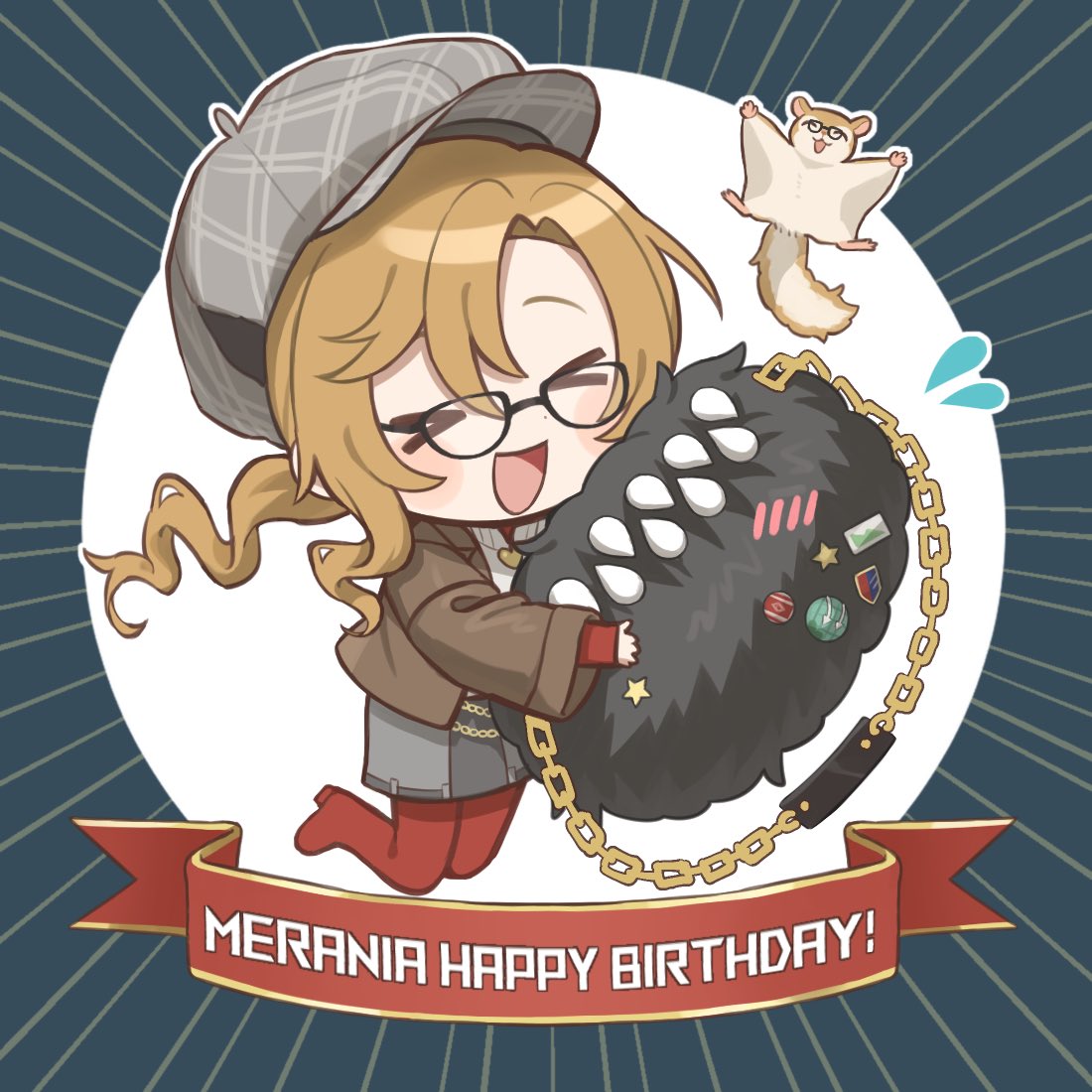 >_< animalization bag black-framed_eyewear black_bag blue_background brown_hair brown_jacket newsboy_cap character_name chibi circle emphasis_lines flower flying_squirrel flying_sweatdrops glasses grey_skirt happy_birthday hat holding holding_bag hug jacket jumping long_hair melania_(reverse:1999) miniskirt ms._acey open_mouth panri pantyhose person_and_animalization ponytail red_flower red_pantyhose reverse:1999 skirt smile squirrel sweater white_sweater