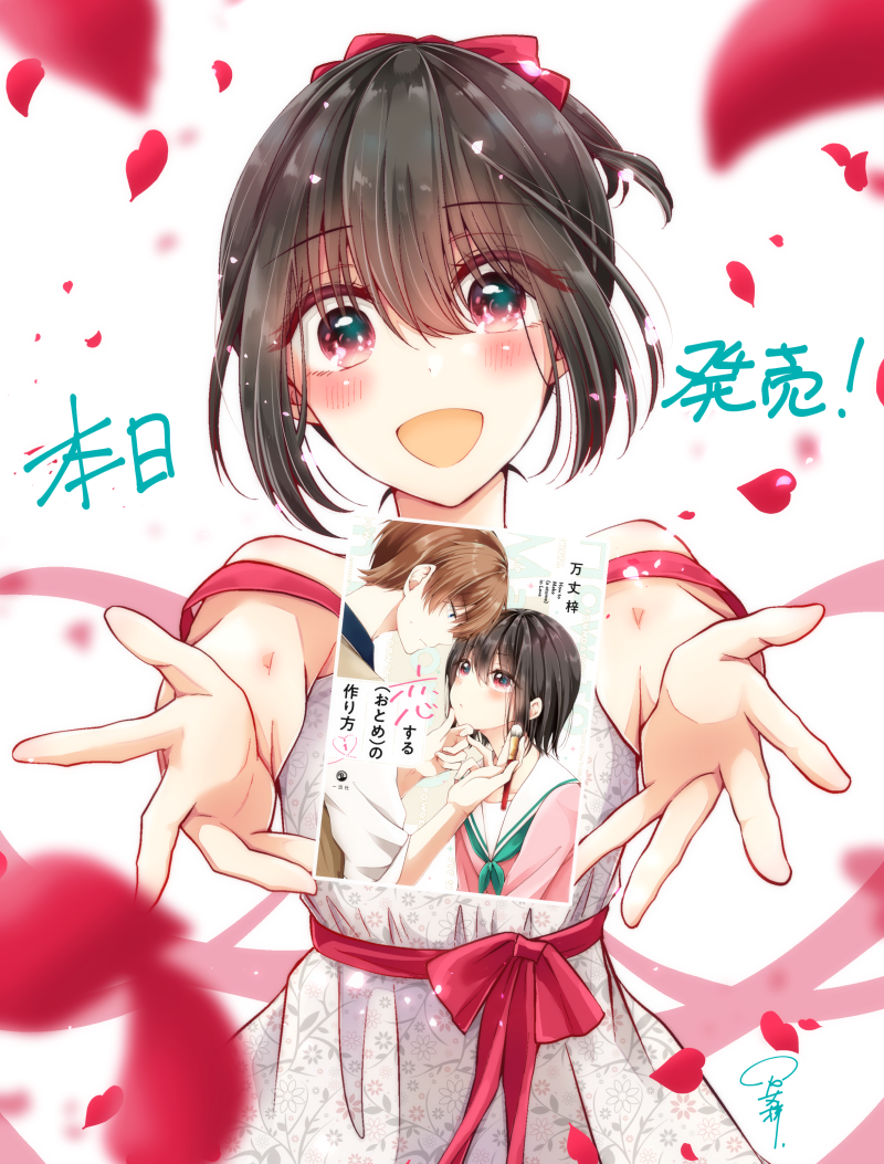 2boys banjou_azusa black_hair blush bow crossdressing dress falling_petals floral_print hair_between_eyes hair_bow koisuru_(otome)_no_tsukurikata looking_at_viewer male_focus midou_kenshirou hiura_mihate multiple_boys open_mouth outstretched_arms petals pink_eyes pink_serafuku ponytail school_uniform serafuku short_hair short_ponytail signature smile solo solo_focus translation_request trap white_dress