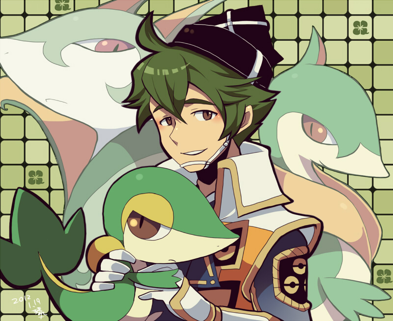 1boy black_hat brown_eyes closed_mouth evolutionary_line gen_5_pokemon gloves green_background green_hair grin hat holding holding_pokemon japanese_clothes kotomaru_(kotokoto_kottan) male_focus mori_motonari_(sengoku_musou) nintendo pokemon pokemon_(creature) pokemon_conquest serperior servine short_hair smile snivy white_gloves