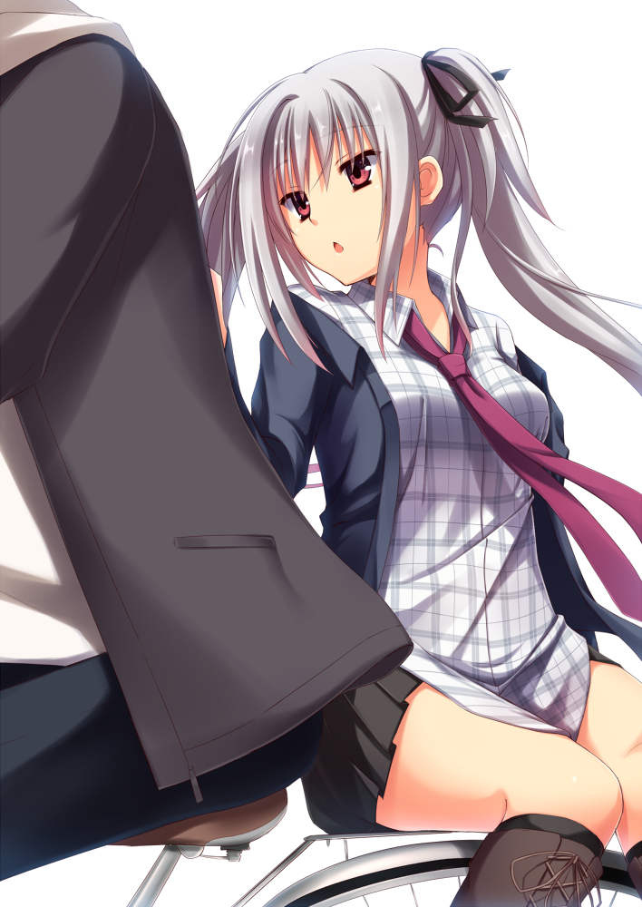 1boy 1girl bicycle black_jacket black_skirt boots brown_footwear casual chestnut_mouth collared_shirt commentary_request cross-laced_footwear dracu-riot! elena_olegovna_owen feet_out_of_frame floating_clothes floating_hair grey_hair hand_on_another's_back hetero jacket long_hair looking_at_another miniskirt mutsura_yuuto necktie open_clothes open_jacket open_mouth plaid_clothes plaid_shirt pleated_skirt red_eyes red_necktie riding riding_bicycle shirt simple_background sitting skirt solo_focus thighs twintails variant_set white_background white_shirt yuzu_modoki