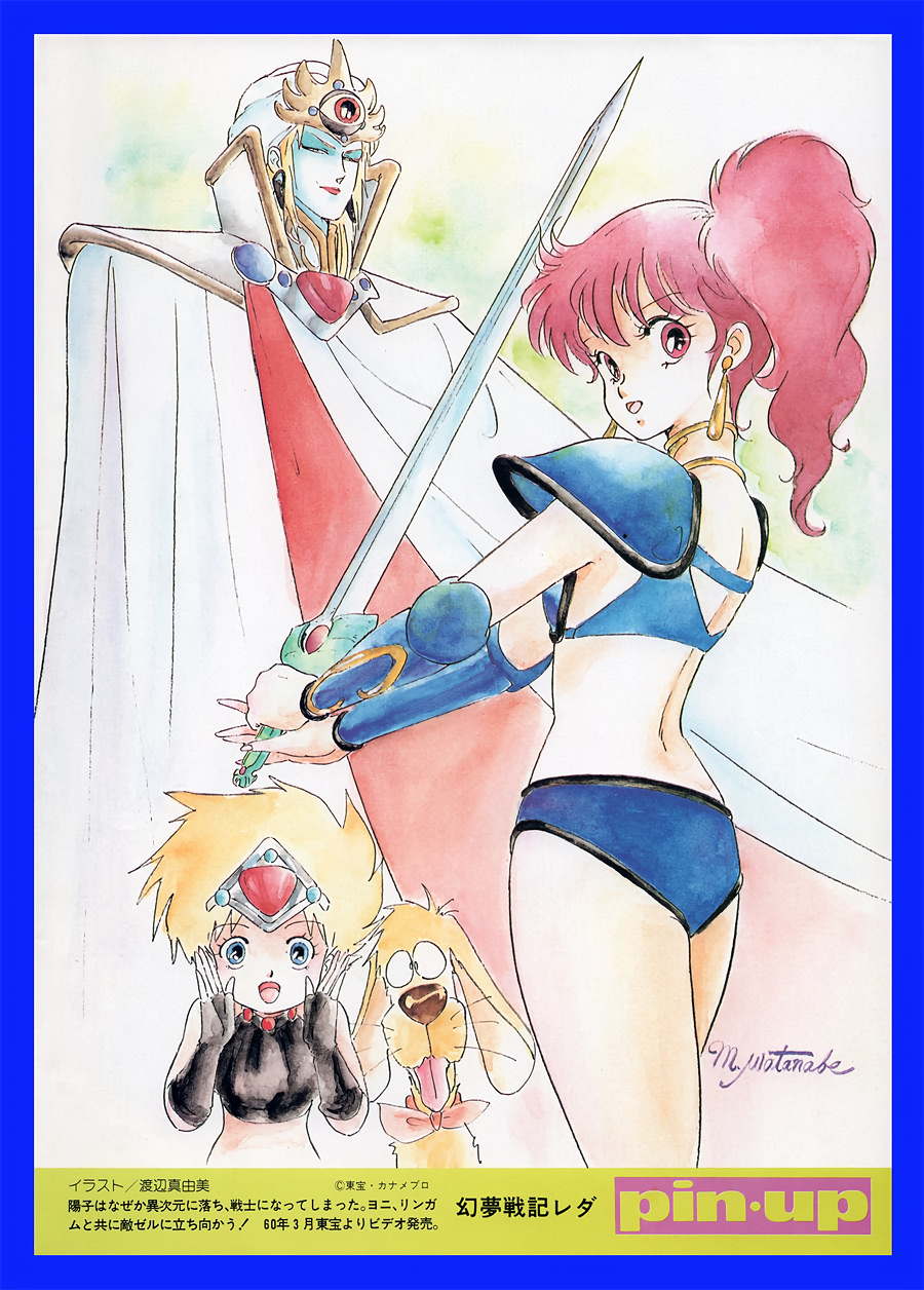 1980s_(style) 1boy 2girls armor asagiri_youko bikini_armor blonde_hair blue_border blue_eyes blue_skin border choker cloak colored_skin dog earrings fingerless_gloves genmu_senki_leda gloves headpiece highres holding holding_sword holding_weapon inomata_mutsumi jewelry lingam lipstick long_hair looking_at_viewer makeup midriff multiple_girls non-web_source official_art oldschool open_mouth painting_(medium) pauldrons red_eyes red_hair red_lips retro_artstyle short_hair shoulder_armor side_ponytail signature sword traditional_media turban vambraces watercolor_(medium) weapon yoni_(leda) zell_(genmu_senki_leda)