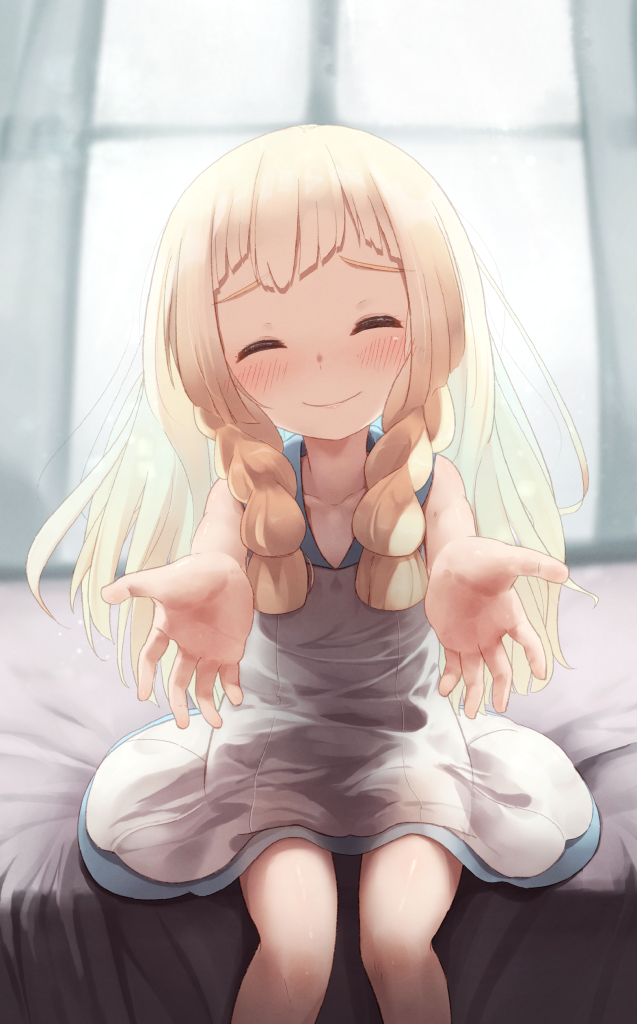 1girl blonde_hair blush braid closed_eyes closed_mouth curtains dress lillie_(pokemon) long_hair nintendo on_bed oren_(770len) outstretched_hand pokemon pokemon_sm sitting sleeveless sleeveless_dress smile solo twin_braids white_dress