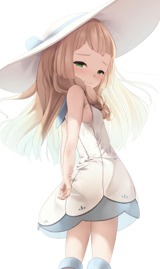 1girl blonde_hair blush braid dress green_eyes hat lillie_(pokemon) looking_at_viewer looking_back medium_hair nintendo oren_(770len) pokemon pokemon_sm sleeveless sleeveless_dress smile solo sun_hat twin_braids white_background white_dress white_hat
