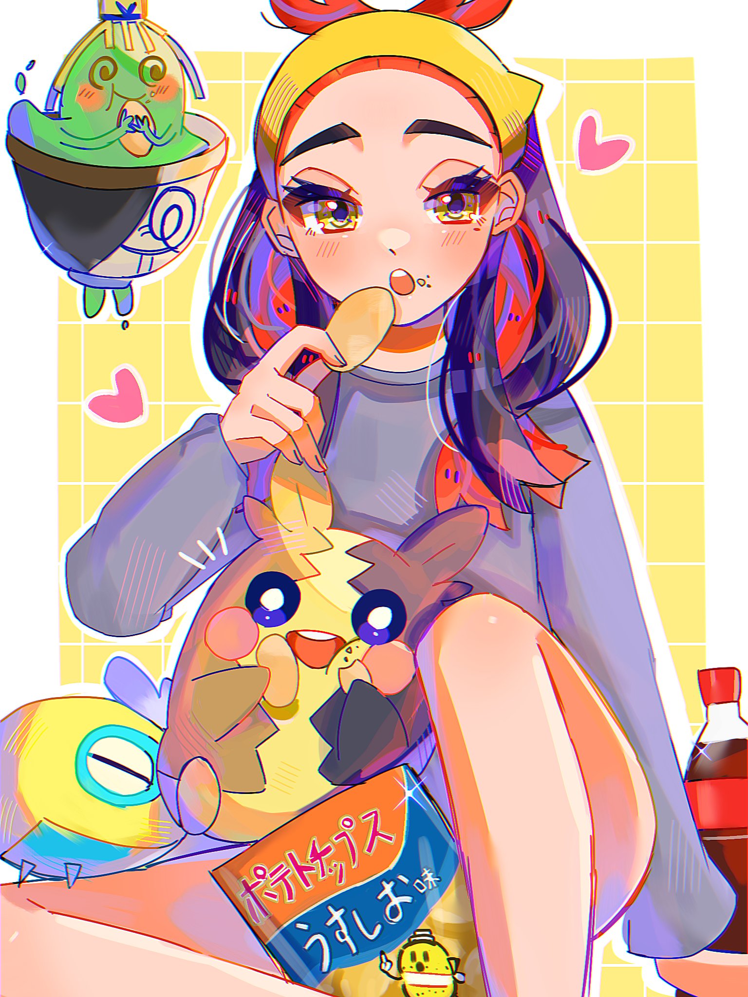1girl black_hair border bottle carmine_(pokemon) chips_(food) cola commentary_request dudunsparce eating eyelashes floating food gen_8_pokemon grey_sweater grid_background hairband heart highres long_hair morpeko multicolored_hair nfvw2evamr86075 nintendo open_mouth outside_border pokemon pokemon_(creature) pokemon_scarlet_and_violet potato_chips red_hair simple_background sinistcha sitting sweater two-tone_hair white_border yellow_background yellow_eyes yellow_hairband