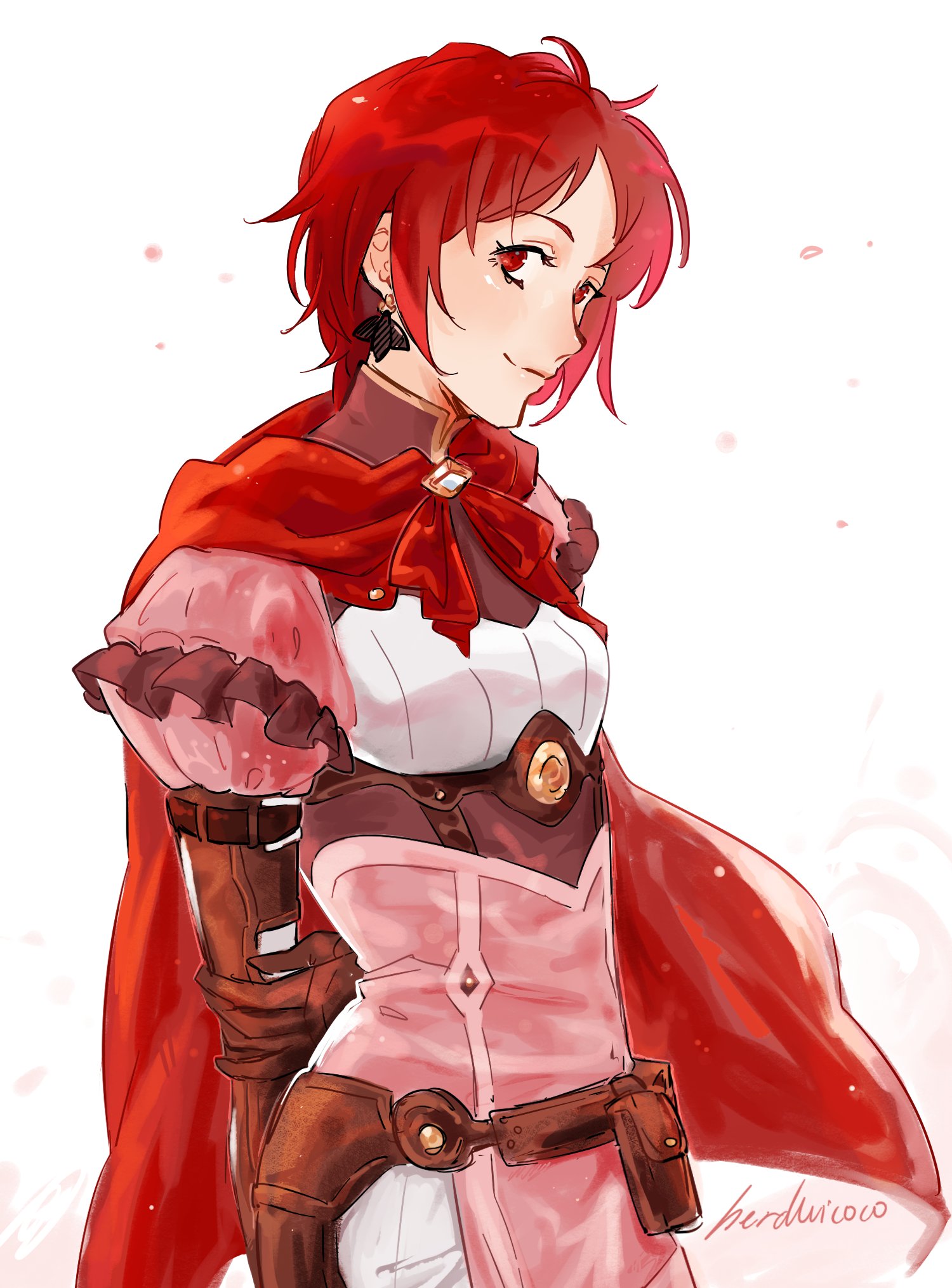 1girl arms_behind_back artist_name brown_gloves cape closed_mouth commentary earrings elbow_gloves fire_emblem fire_emblem:_three_houses fire_emblem_warriors:_three_hopes gloves herdwicoco highres jewelry monica_von_ochs nintendo pouch puffy_sleeves red_cape red_eyes red_hair short_hair signature simple_background smile solo standing twitter_username white_background