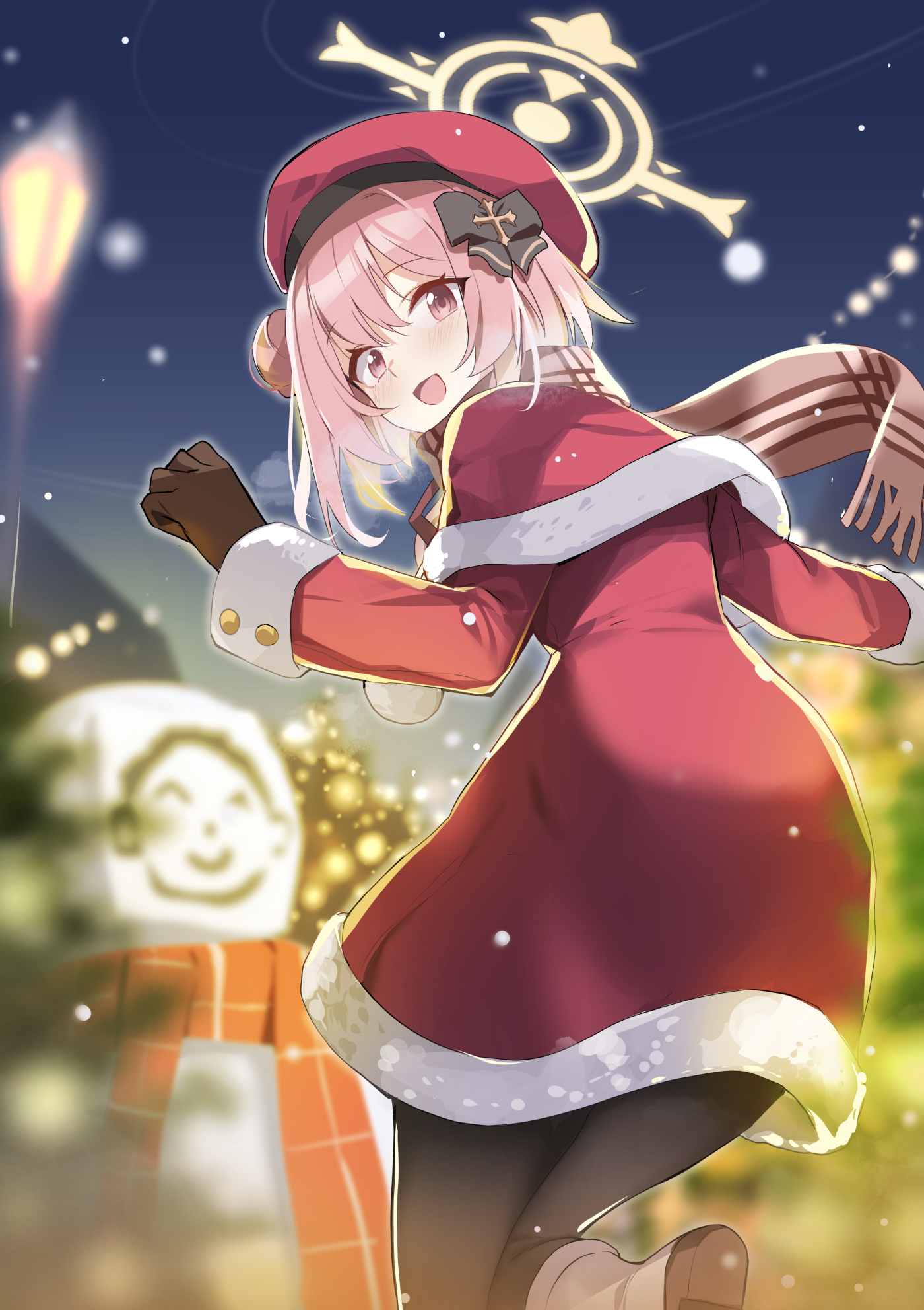 1girl beret black_pantyhose blue_archive blush brown_gloves brown_scarf brown_shoes capelet clonatenshi coat doodle_sensei_(blue_archive) fringe_trim gloves hair_bun halo hat highres long_sleeves open_mouth pantyhose pink_eyes pink_hair red_capelet red_coat red_hat scarf sensei_(blue_archive) serina_(blue_archive) serina_(christmas)_(blue_archive) shoes short_hair single_side_bun smile snowman socks solo white_socks yellow_halo