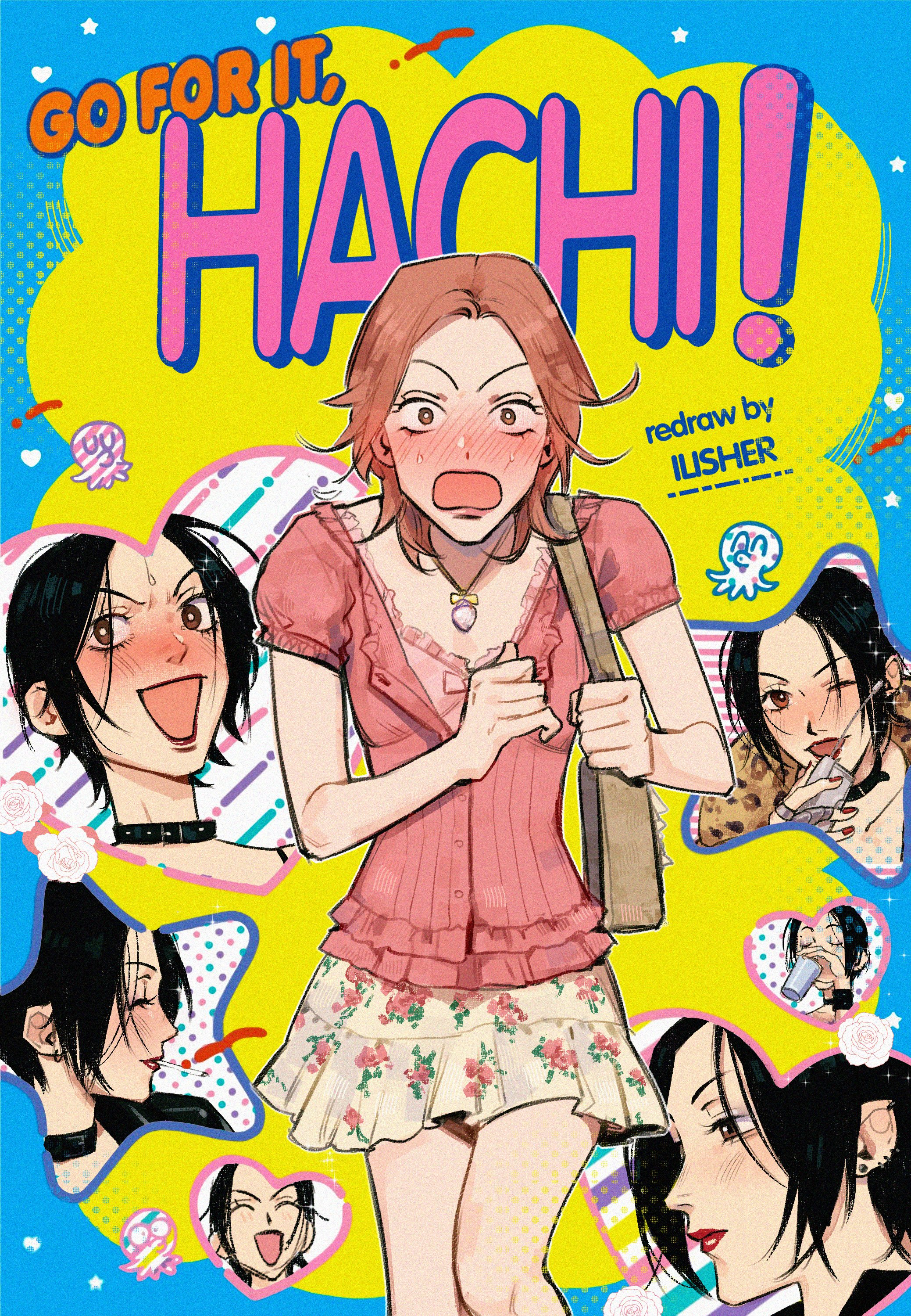 2girls absurdres bag beige_skirt black_collar black_hair blush brown_eyes cigarette closed_mouth collar ear_piercing embarrassed english_text ! eyelashes female_focus floral_print hand_up handbag heart highres ilisher jewelry komatsu_nana lips lipstick long_hair makeup meme multiple_girls multiple_views nana_(series) necklace open_mouth osaki_nana parted_lips piercing pink_shirt pleated_skirt red_hair red_lips shirt skirt squid standing star_(symbol) sweat sweatdrop yuri
