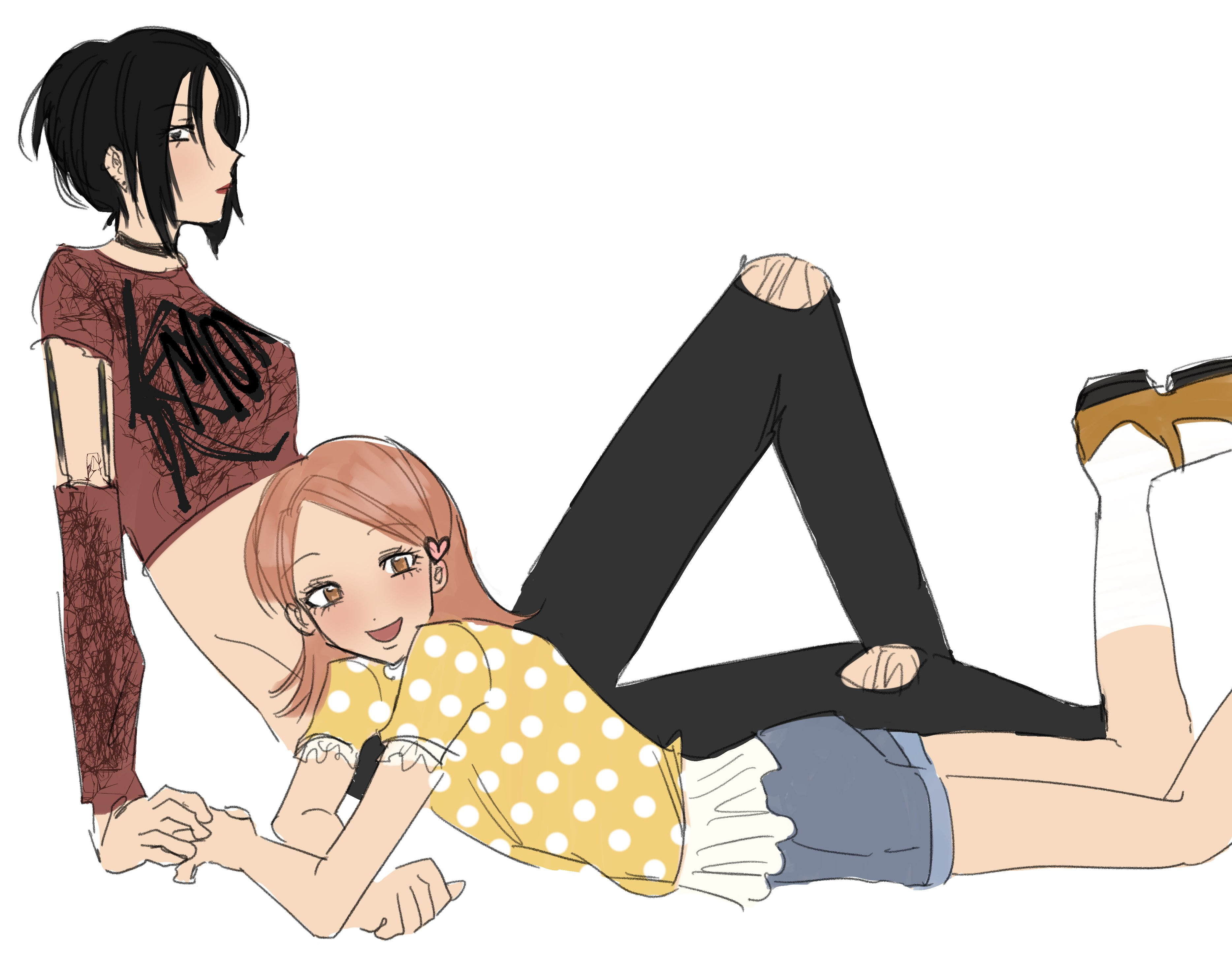2girls absurdres black_collar black_eyes black_hair black_pants blue_shirt blush brown_eyes brown_footwear kneehighs closed_mouth collar crop_top denim detached_sleeves ear_piercing full_body hair_ornament heart heart_hair_ornament highres holding_hands jeans komatsu_nana lipstick looking_at_viewer lying makeup multiple_girls nana_(series) on_stomach open_mouth osaki_nana pants piercing red_hair red_lips red_shirt shirt short_sleeves simple_background sitting sketch socks torn_clothes torn_jeans torn_pants white_background white_footwear white_socks y4ntaoist yellow_shirt yuri