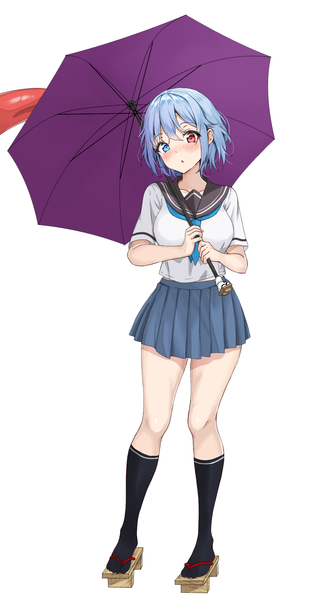 1girl alternate_costume amagi_(amagi626) blue_eyes blue_hair blue_neckerchief blue_skirt breasts curious full_body hair_between_eyes heterochromia highres holding holding_umbrella kneehighs large_breasts medium_hair midriff_peek miniskirt neckerchief open_mouth pleated_skirt red_eyes sailor_collar sandals school_uniform serafuku short_hair skirt socks solo standing staring tatara_kogasa thighs touhou umbrella