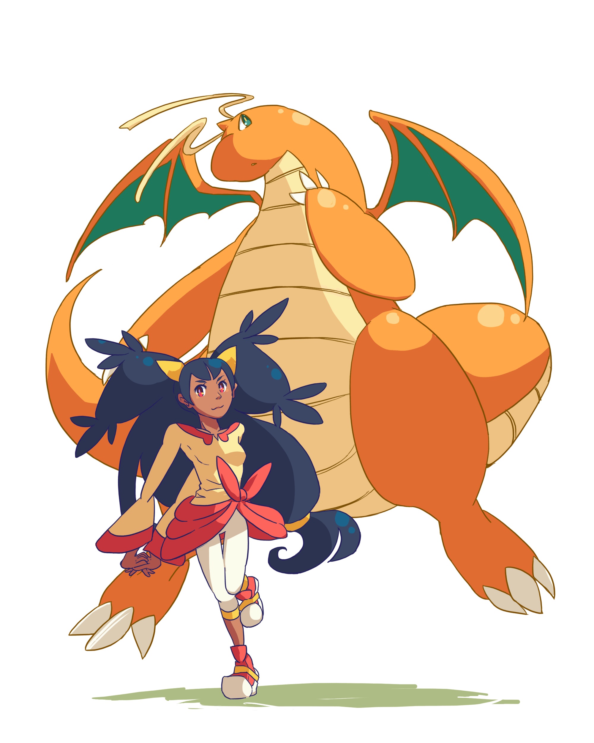 1girl :3 absurdres antennae big_hair breasts dark-skinned_female dark_skin dragon dragonite floating gen_1_pokemon girl_and_dragon highres horns imaha_sastsuki iris_(pokemon) looking_at_another nintendo pokemon pokemon_(anime) pokemon_(creature) pokemon_the_series:_black_&_white purple_hair single_horn smile twintails