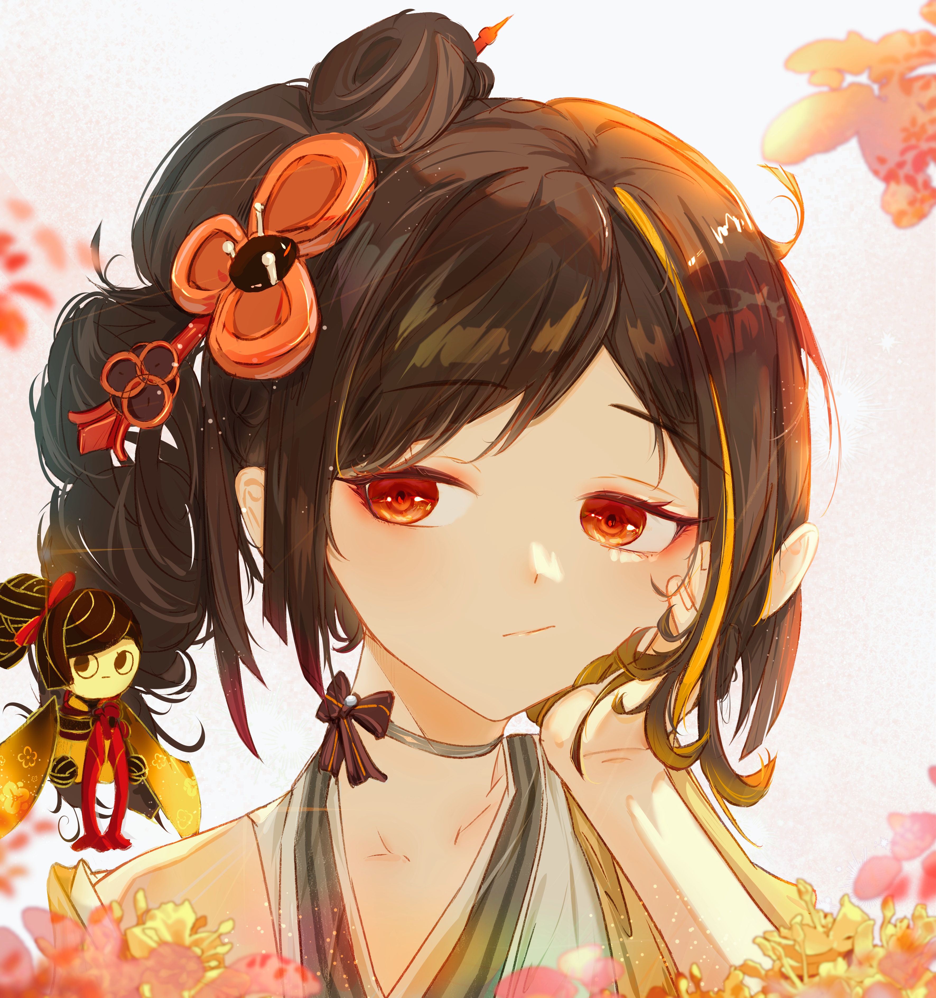 1girl :/ absurdres asymmetrical_sidelocks blonde_hair brown_hair chiori_(genshin_impact) choker commentary_request drill_hair drill_ponytail genshin_impact grey_kimono hair_ornament haori head_rest highres japanese_clothes kimono long_hair looking_to_the_side luo_(tfpx7458) multicolored_hair off_shoulder red_eyes ribbon_choker sidelocks simple_background sleeveless sleeveless_kimono solo tamoto_(genshin_impact) upper_body