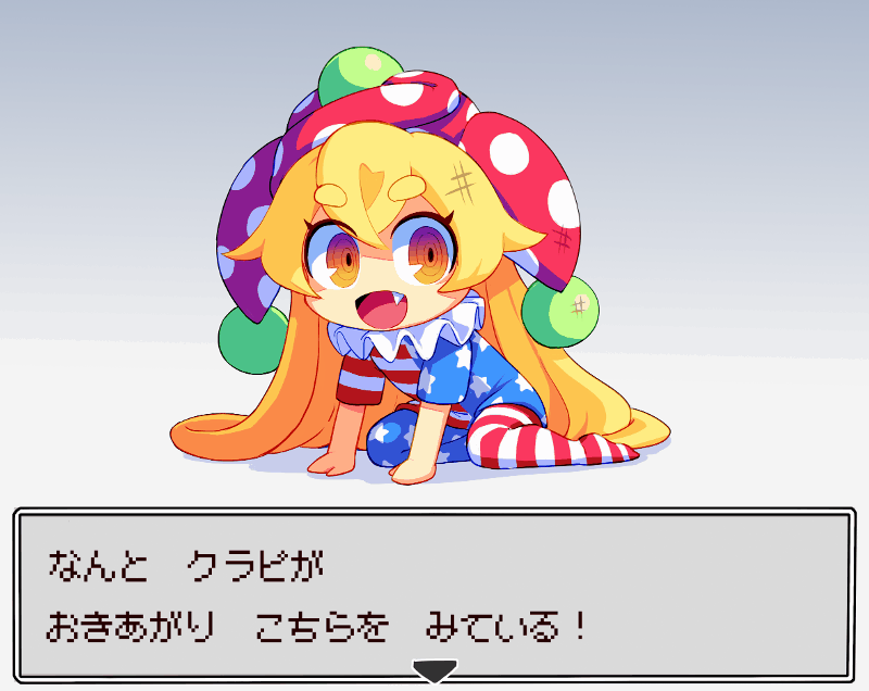 1girl ? american_flag american_flag_print animated animated_gif arm_support blonde_hair blush chibi clownpiece dialogue_box fang flag_print long_hair looking_at_viewer open_mouth pantyhose ranka_(tonbo) red_eyes smile solo thick_eyebrows touhou translation_request