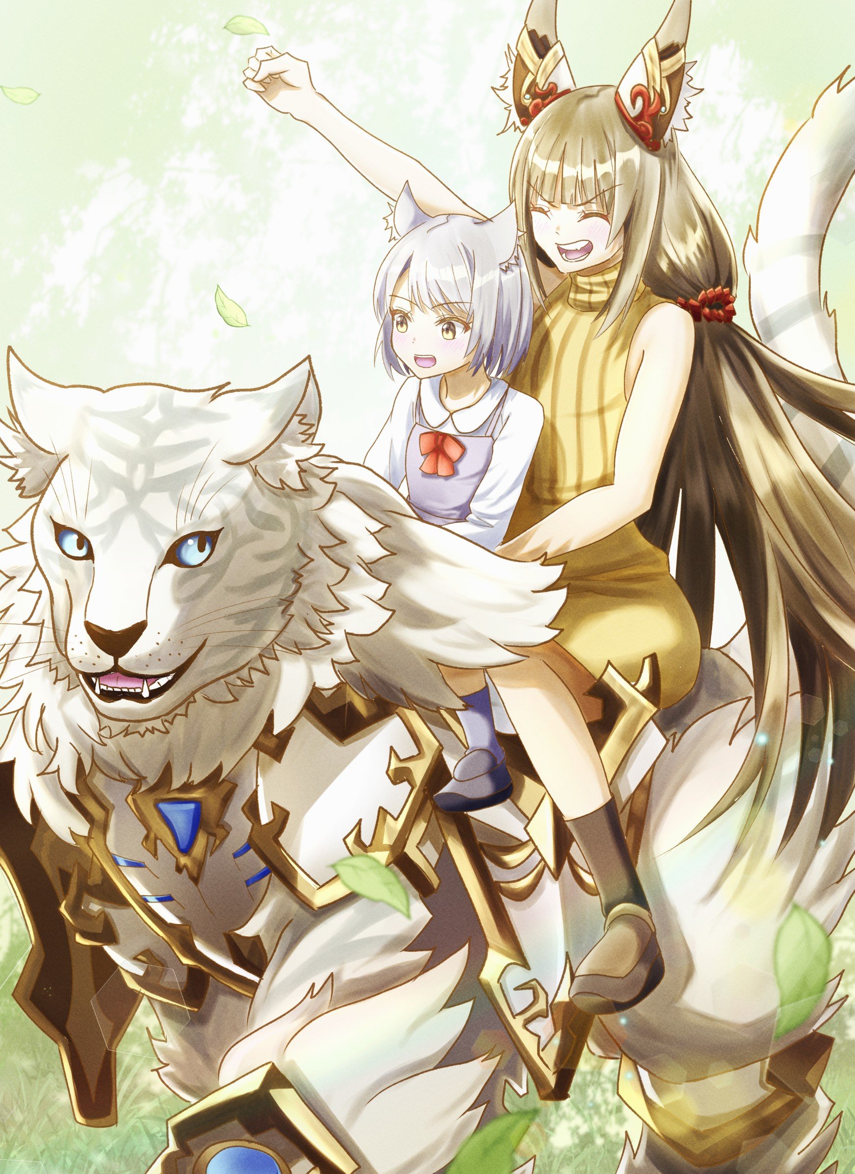 2girls :d ^_^ absurdres animal_ear_fluff animal_ears arm_up blue_eyes boots bow bowtie brown_footwear brown_hair cat_ears cat_girl closed_eyes commentary_request dromarch_(xenoblade) grey_hair highres long_hair medium_hair mio_(xenoblade) mother_and_child mother_and_daughter multiple_girls nia_(xenoblade) open_mouth parent_and_child red_bow red_bowtie sharp_teeth smile teeth tiger very_long_hair white_fur xenoblade_chronicles_(series) xenoblade_chronicles_2 xenoblade_chronicles_3