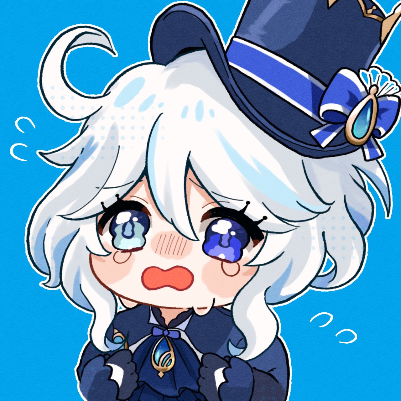 1girl ahoge ascot blue_ascot blue_background blue_bow blue_eyes blue_gem blue_gloves blue_hair blue_hat blue_jacket blush bow brooch chibi commentary_request crying crying_with_eyes_open drop-shaped_pupils eyelashes flying_sweatdrops furina_(genshin_impact) gem genshin_impact gloves hair_between_eyes half_gloves hands_up hat hat_bow heterochromia highres jacket jewelry kogamo_(user_vajm2737) long_sleeves looking_at_viewer mismatched_pupils multicolored_hair open_mouth outline parted_bangs raised_eyebrows short_hair sidelocks simple_background solo streaked_hair swept_bangs symbol-shaped_pupils tears tilted_headwear top_hat upper_body wavy_eyes wavy_mouth white_hair white_outline