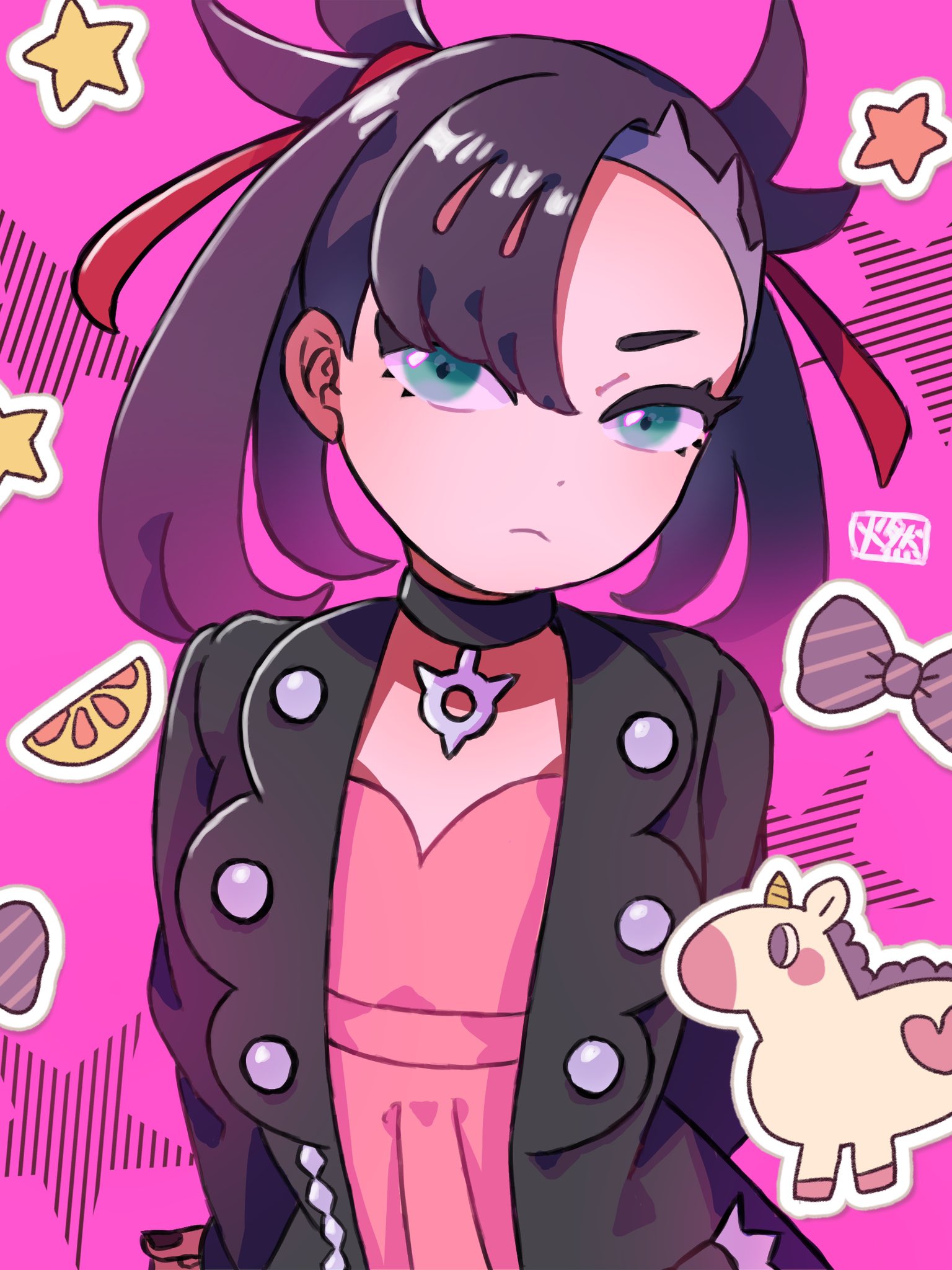 1girl arms_behind_back asymmetrical_bangs black_collar black_hair black_jacket black_nails bow bowtie closed_mouth collar commentary_request food fruit green_eyes highres jacket light_frown looking_at_viewer marnie_(pokemon) medium_hair nintendo open_clothes open_jacket orange_(fruit) orange_slice pink_background pokemon pokemon_sword_and_shield solo star_(symbol) touge_moe unicorn upper_body