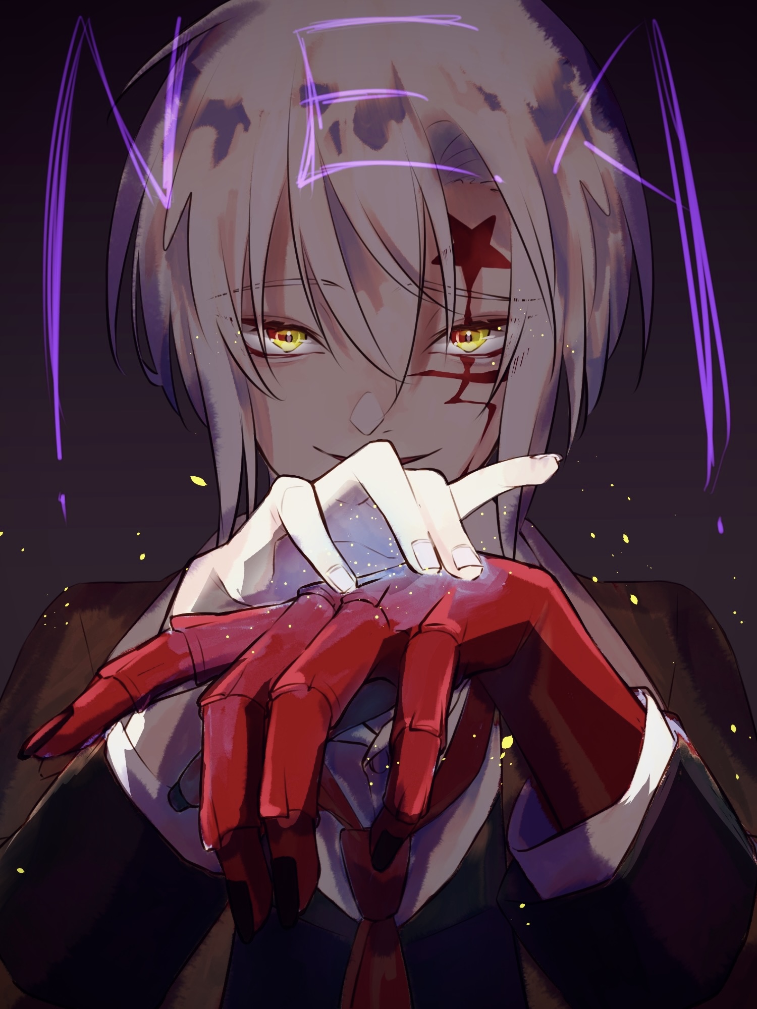 1boy allen_walker black_nails bokuhaboku character_name colored_skin d.gray-man dark_background dark_persona dated_commentary foreshortening gloves glowing glowing_eyes hair_between_eyes highres long_sleeves looking_at_viewer male_focus multicolored_skin red_skin scar scar_across_eye scar_on_face shirt short_hair smile solo upper_body yellow_eyes