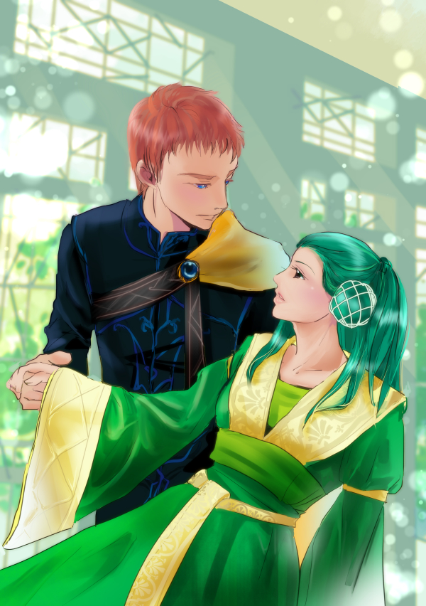 1boy 1girl aged_down blue_eyes dress elvira_(honzuki_no_gekokujou) eye_contact green_dress green_hair hair_ornament hetero holding_hands honzuki_no_gekokujou husband_and_wife indoors karstedt_(honzuki_no_gekokujou) long_hair looking_at_another seion_sakura smile wide_sleeves