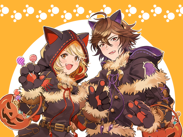 1boy 1girl ahoge animal_ear_hairband animal_ears animal_hands animal_hood belt blonde_hair blush brown_eyes brown_hair candy capelet cat_ear_hairband cat_ears cat_hood cat_paws coat commentary commentary_request cowboy_shot cross-laced_clothes cunonn djeeta_(granblue_fantasy) embarrassed fake_animal_ears fang food fur-trimmed_capelet fur-trimmed_coat fur-trimmed_gloves fur_trim gloves granblue_fantasy hair_between_eyes hairband halloween_bucket halloween_costume holding holding_candy holding_food hood hood_down hood_up light_blush lollipop looking_at_viewer messy_hair nekomancer_(granblue_fantasy) open_mouth orange_background paw_print paw_print_background red_eyes sandalphon_(granblue_fantasy) short_hair smile sweatdrop