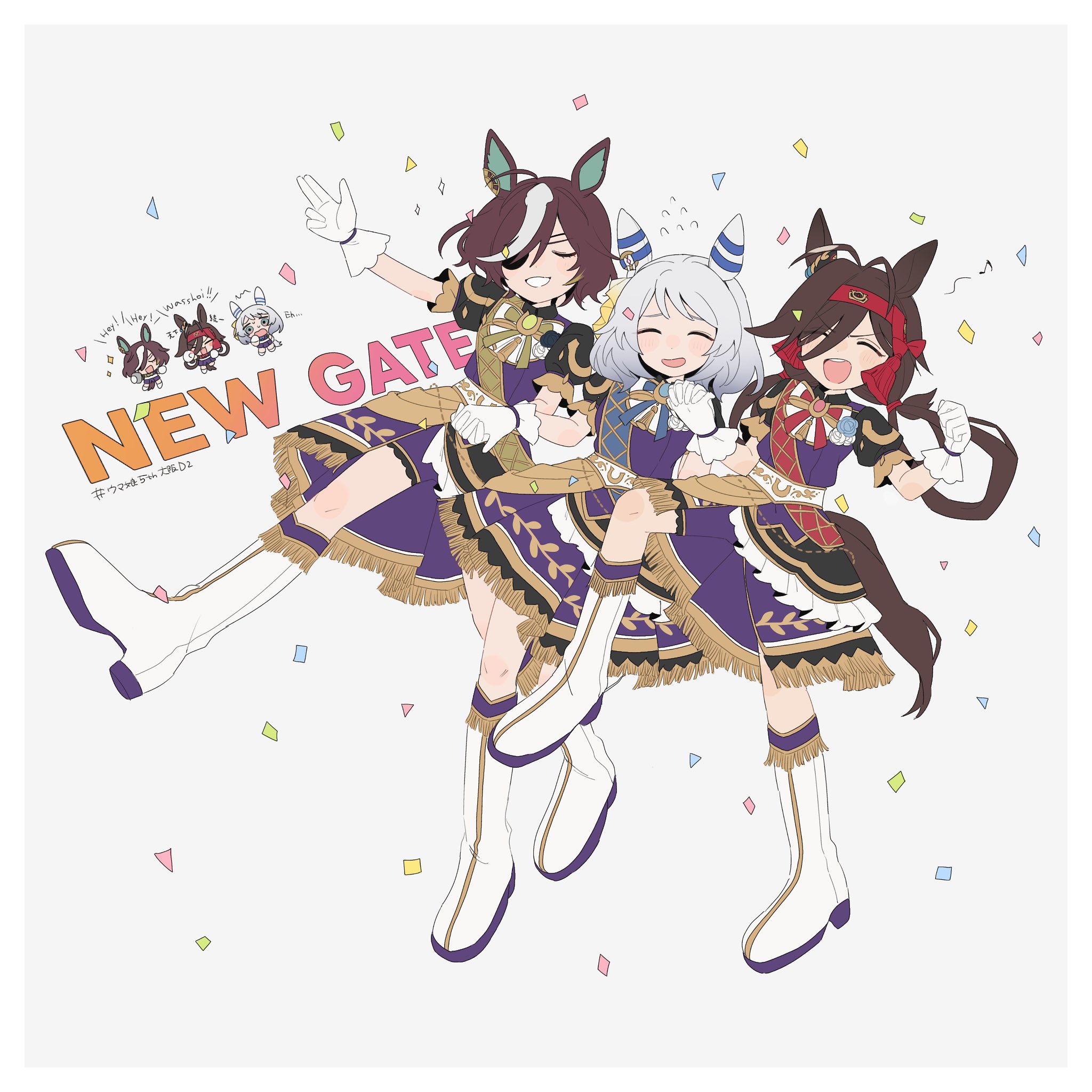 3girls animal_ears boots bow brown_hair closed_eyes ear_covers ear_ornament eyepatch gate_of_infinity_(umamusume) gloves grey_hair gun hair_between_eyes hair_ornament hair_over_one_eye hairband handgun headband highres hishi_miracle_(umamusume) horse_ears horse_girl horse_tail kamijihoshiko knee_boots leg_lift long_hair medium_hair multicolored_hair multiple_girls no_reason_(umamusume) open_mouth short_hair skirt smile streaked_hair tail tanino_gimlet_(umamusume) umamusume weapon white_background white_footwear white_gloves white_hair yellow_eyes