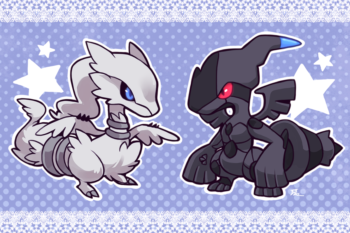 animal_focus black_sclera blue_background blue_eyes colored_sclera commentary_request full_body gen_5_pokemon kotomaru_(kotokoto_kottan) legendary_pokemon nintendo no_humans outline pokemon pokemon_(creature) polka_dot polka_dot_background red_sclera reshiram signature star_(symbol) white_outline zekrom