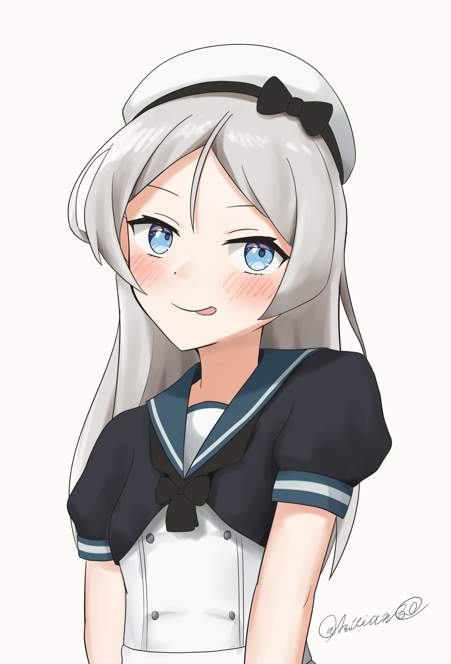 1girl absurdres black_jacket black_neckerchief blue_eyes blue_sailor_collar dress grey_hair hat highres jacket javelin_(kancolle) kantai_collection l_meet long_hair looking_at_viewer neckerchief sailor_collar sailor_hat short_sleeves simple_background solo tongue tongue_out twitter_username upper_body white_background white_dress white_hat
