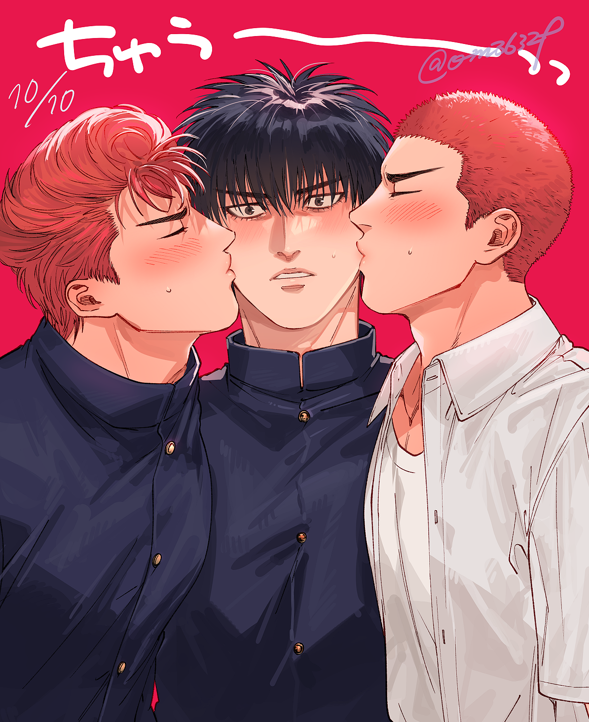3boys black_hair black_jacket blush boy_sandwich buttons cheek_kiss closed_eyes dated double_cheek_kiss dual_persona gakuran highres jacket kiss kissing_cheek looking_at_viewer male_focus multiple_boys om3632f open_clothes open_shirt pompadour red_background red_hair rukawa_kaede sakuragi_hanamichi sandwiched school_uniform shirt short_hair simple_background slam_dunk_(series) tank_top translated twitter_username upper_body white_shirt white_tank_top yaoi