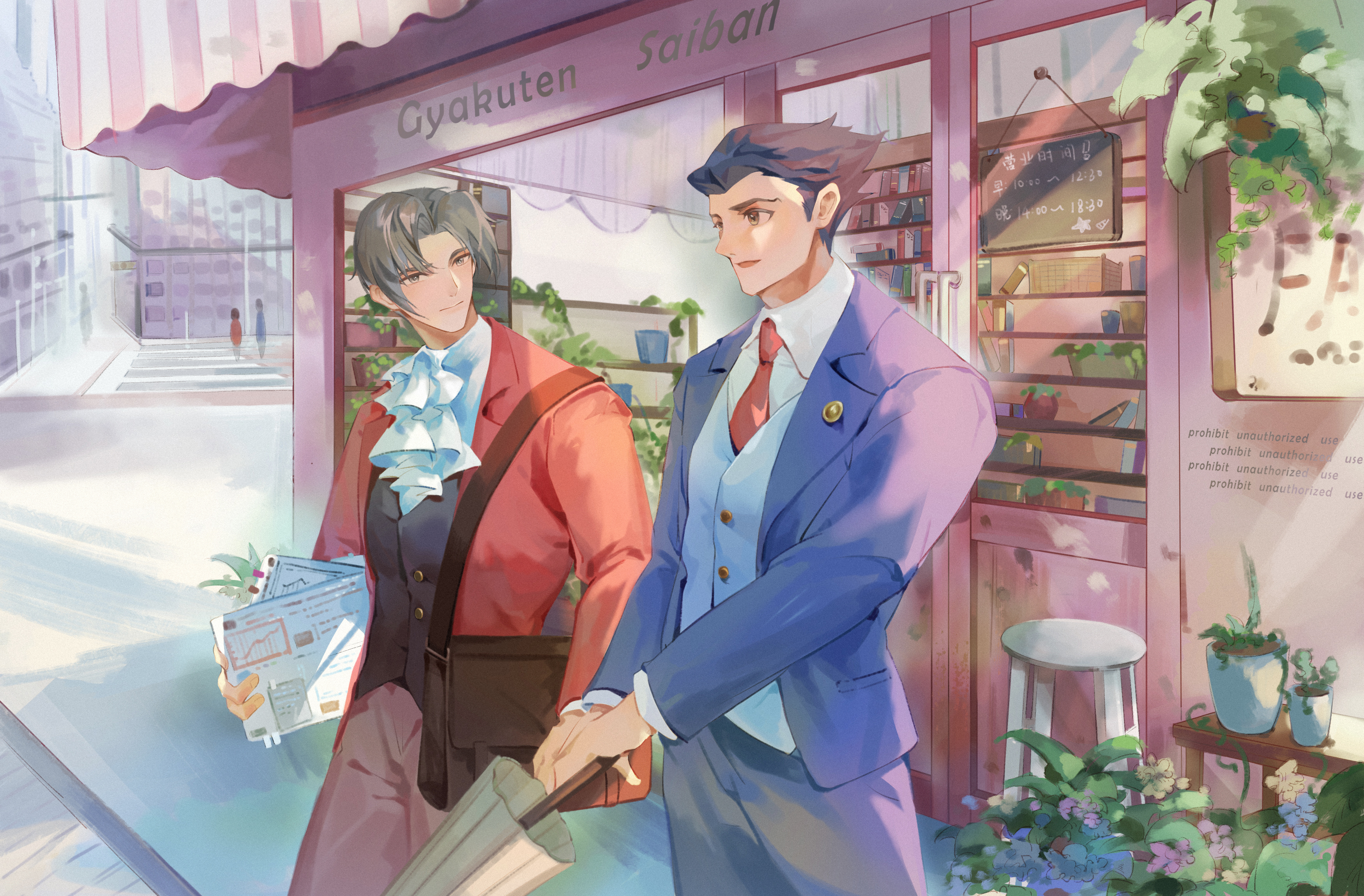 2boys absurdres ace_attorney ascot bag black_hair blue_suit closed_mouth collared_shirt copyright_name formal_clothes grey_hair gugu_(guming304) highres holding holding_umbrella jacket long_sleeves looking_at_another male_focus messenger_bag miles_edgeworth multiple_boys necktie open_mouth pants phoenix_wright red_jacket red_necktie red_suit shirt short_hair shoulder_bag spiked_hair suit town umbrella vest white_ascot white_shirt