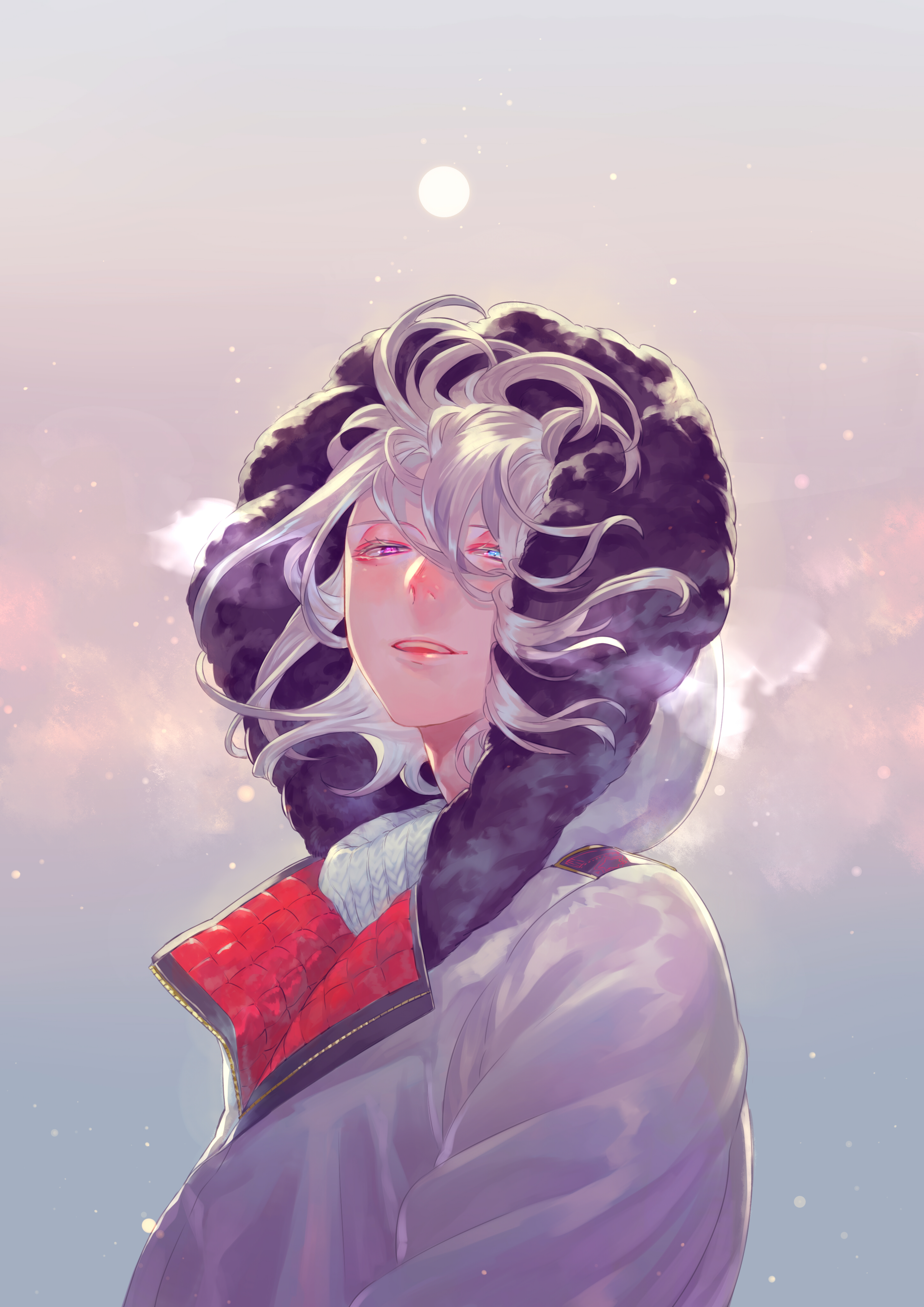 1boy absurdres blue_eyes breath coat commentary_request fasna full_moon fur-trimmed_hood fur_trim grey_coat heterochromia highres hood hood_up hooded_coat looking_at_viewer male_focus moon original parted_lips partially_unzipped purple_eyes short_hair sky teeth turtleneck upper_body upper_teeth_only white_hair zipper