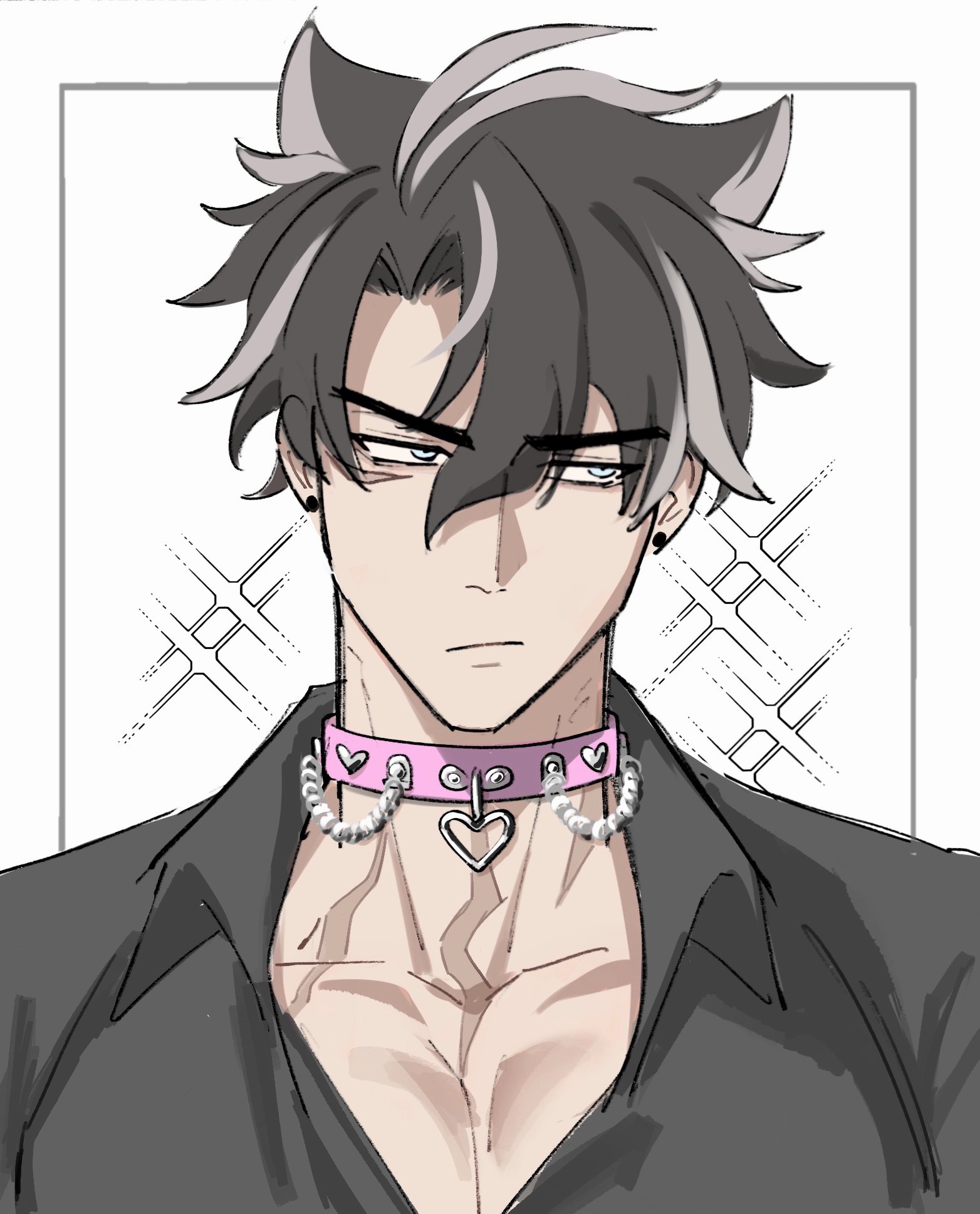 1boy acupofbread averting_eyes black_hair black_shirt blue_eyes choker closed_mouth collarbone collared_shirt commentary earrings english_commentary facial_scar frown genshin_impact grey_hair hair_between_eyes heart heart_choker heart_pendant highres jewelry male_focus multicolored_hair parted_bangs pectoral_cleavage pectorals pendant pendant_choker pink_choker scar scar_on_cheek scar_on_face scar_on_neck shirt short_hair sideways_glance simple_background solo sparkle streaked_hair stud_earrings upper_body v-shaped_eyebrows white_background wing_collar wriothesley_(genshin_impact)