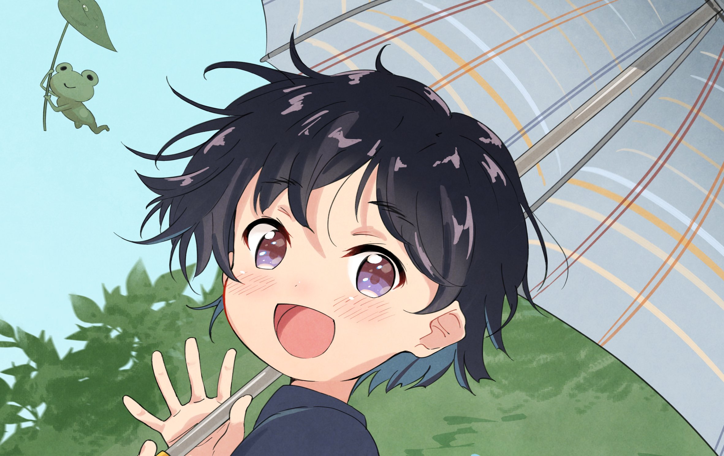 1girl black_hair blue_eyes bush close-up frog highres holding holding_umbrella looking_at_viewer nekopantsu_(blt) open_mouth original shirt short_hair smile solo umbrella