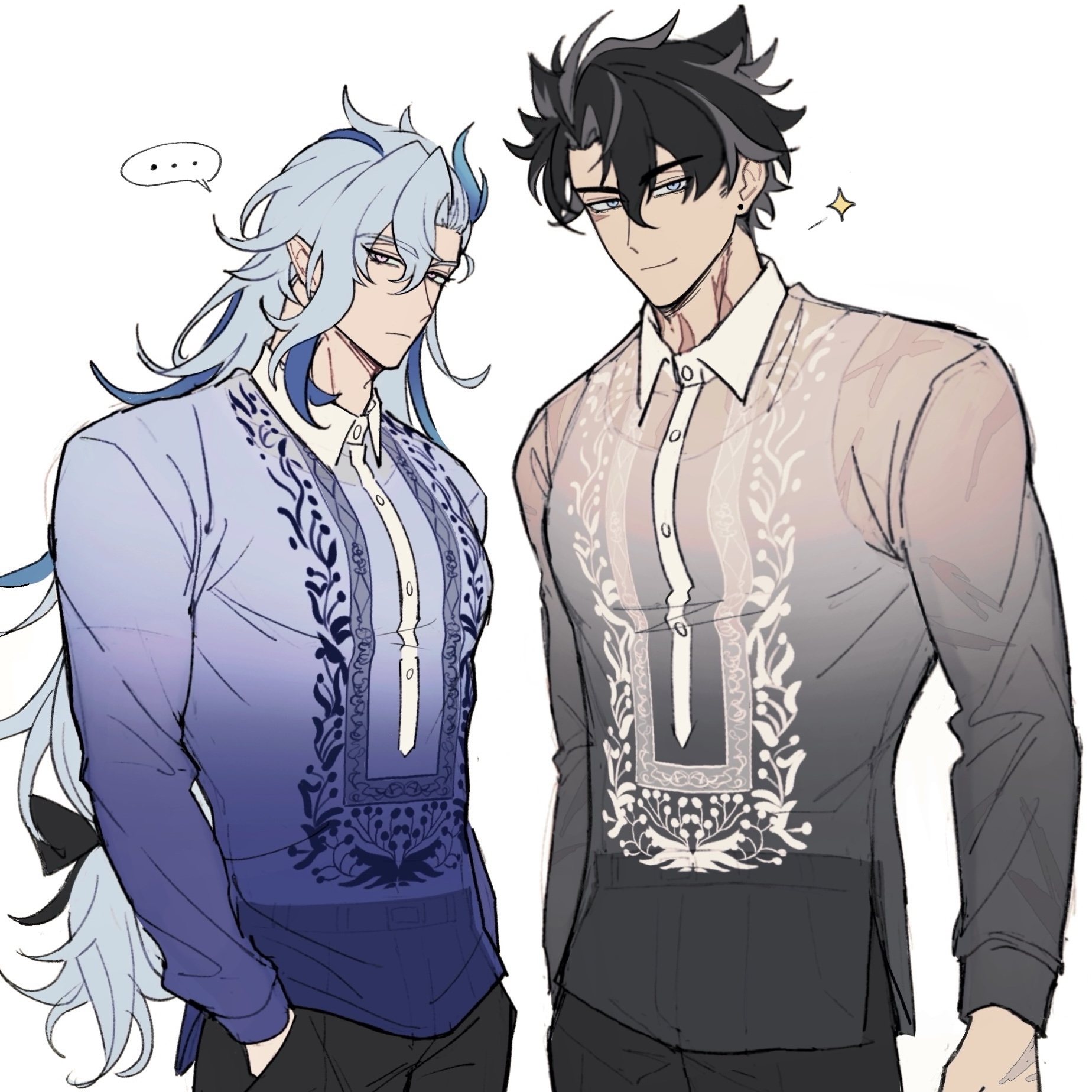 ... 2boys acupofbread asymmetrical_bangs black_bow black_hair blue_eyes blue_hair blue_shirt bow brown_shirt buttons closed_mouth collared_shirt commentary earrings english_commentary expressionless facial_scar genshin_impact gradient_clothes gradient_shirt grey_hair grey_shirt hair_between_eyes hair_bow hands_in_pockets highres jewelry long_hair long_sleeves looking_at_viewer low-tied_long_hair male_focus multicolored_hair multiple_boys neuvillette_(genshin_impact) parted_bangs pointy_ears purple_eyes scar scar_on_cheek scar_on_face scar_on_neck shirt short_hair simple_background smile sparkle speech_bubble spoken_ellipsis standing streaked_hair stud_earrings very_long_hair white_background wing_collar wriothesley_(genshin_impact)