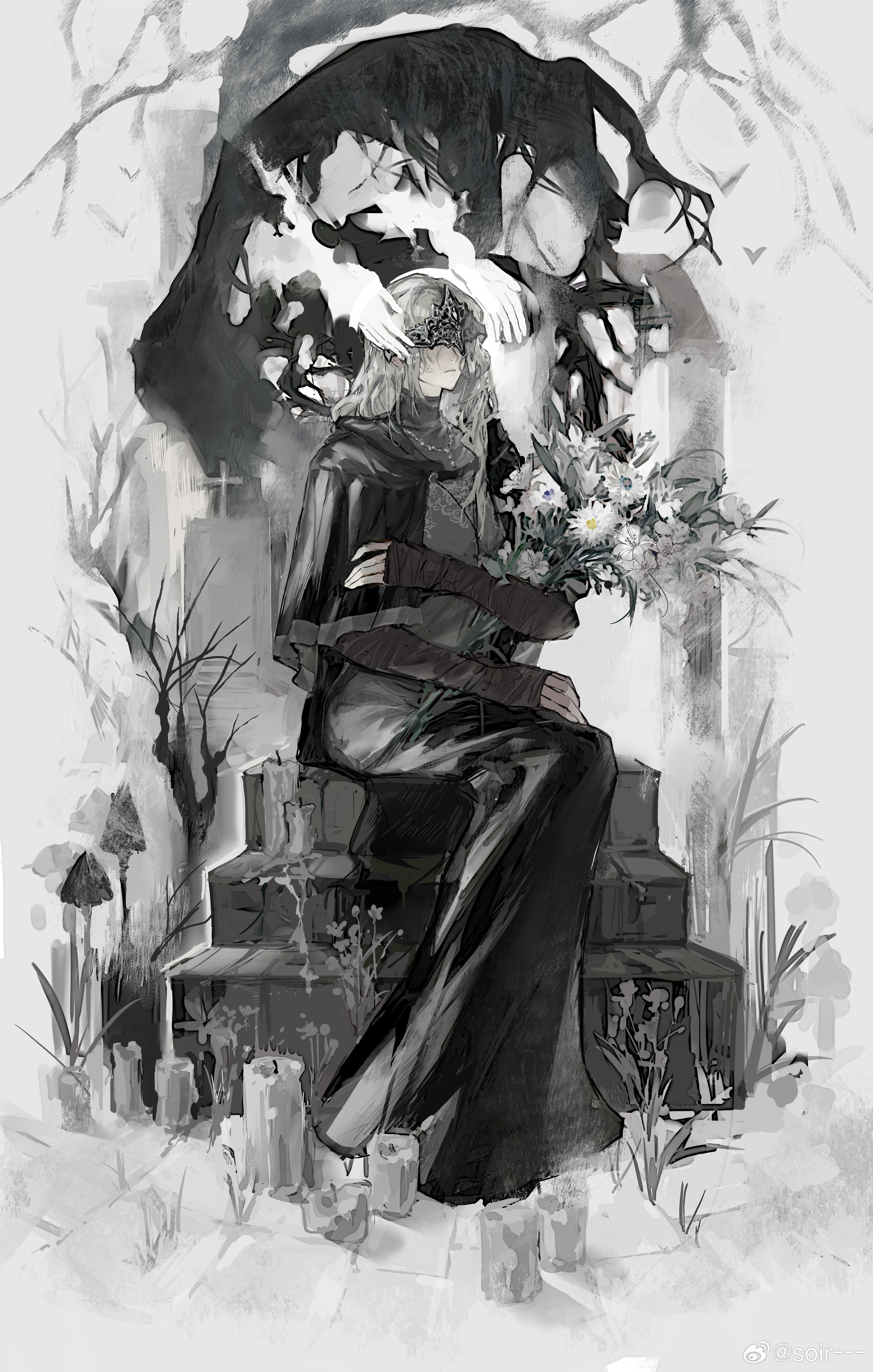 1girl absurdres bare_tree black_capelet black_robe blindfold blindfold_mask bouquet candle capelet chinese_commentary commentary_request covered_eyes dark_souls_(series) dark_souls_iii expressionless facing_viewer fire_keeper flower from_side full_body ghost_hands grey_hair highres holding holding_bouquet limited_palette long_sleeves mask medium_hair niutoutou outdoors robe sitting sleeves_past_wrists solo stairs tombstone tree watermark weibo_watermark white_flower