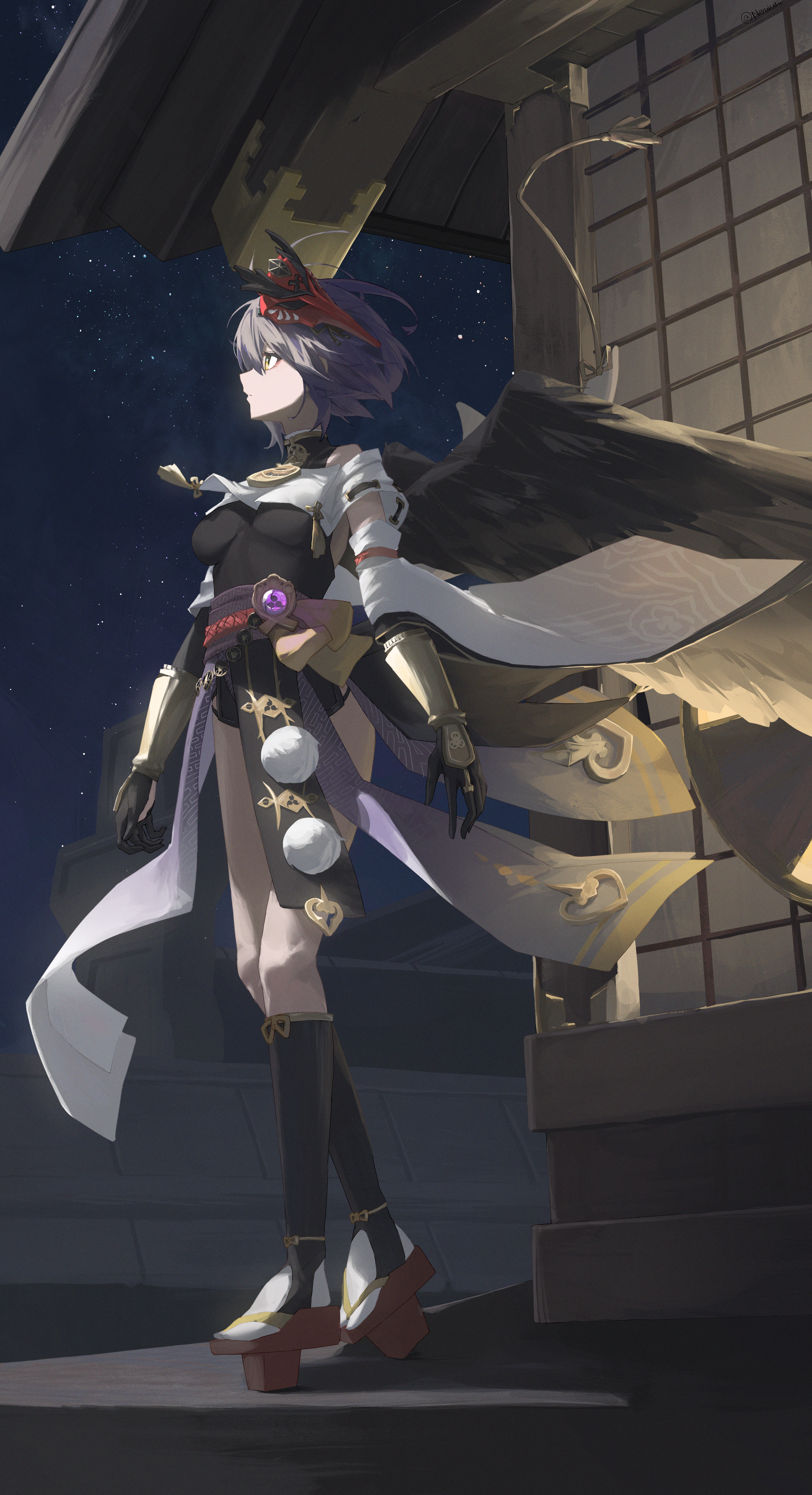 1girl absurdres architecture arm_guards armpits arms_at_sides artist_request bare_shoulders black_gloves black_wings blue_hair single_breast_curtain breasts clenched_hands collarbone collared_shirt dark_blue_hair detached_sleeves east_asian_architecture elbow_gloves expressionless eyelashes feathered_wings female_focus full_body genshin_impact geta gloves heel_up highres huge_filesize japanese_clothes jewelry kneehighs kujou_sara legs looking_up mask mask_on_head medium_breasts medium_hair mihoyo multiple_wings neck necklace night obi outdoors profile sandals sash shirt shorts shorts_under_skirt sidelocks sky sleeveless sleeveless_shirt socks standing star_(sky) starry_sky swept_bangs tabi tassel tengu tengu-geta tengu_mask thighs tight_clothes tight_shirt tomoe_(symbol) vision_(genshin_impact) wide_sleeves wind wind_lift wings yellow_eyes