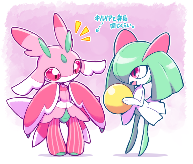 ball bug colored_skin gen_3_pokemon gen_7_pokemon green_hair hair_over_one_eye holding holding_ball kirlia lurantis multicolored_skin nintendo nollety open_mouth pink_background pink_eyes pink_skin pokemon pokemon_(creature) sidelocks simple_background smile translation_request two-tone_skin white_skin